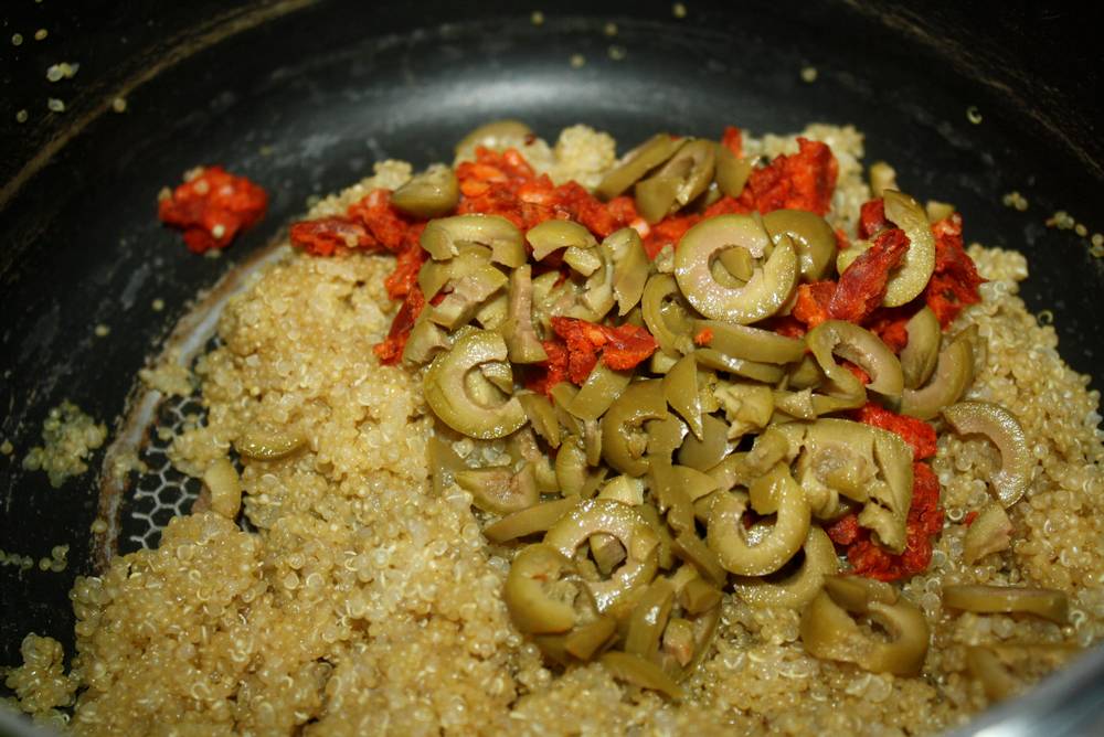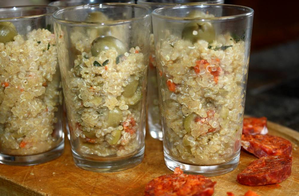 Dans un premier temps, faisons cuire le quinoa dans une casserole d’eau bouillante pendant 10 minutes. Une fois le quinoa cuit, faisons le refroidir. Pendant ce temps coupons les olives et le chorizo en petit morceau et ajoutons au quinoa. Il nous suffit d’ajouter le vinaigre et l‘huile et de mélanger le tout et d’assaisonner à sa guise.