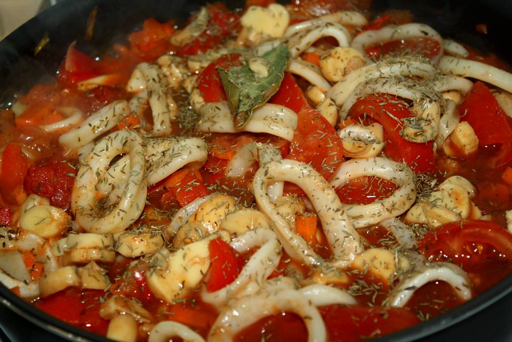 Dans un premier temps, nous ferons revenir notre oignon. Une fois qu’ils commencent à dorer, ajoutons les carottes, poivrons coupés en dés. Laissons cuire quelques minutes à feu vif. Intégrons la purée, les tomates pelées, et les tomates fraîches puis les calamars. Nous pouvons également ajouter le thym, le laurier, la gousse d’ail, le piment d’espelette (n’en mettait pas 2 pincées si vous êtes sensible au piment) et les champignons. Il nous suffit de faire mijoter le tout 20 à 30 minutes à feu doux.