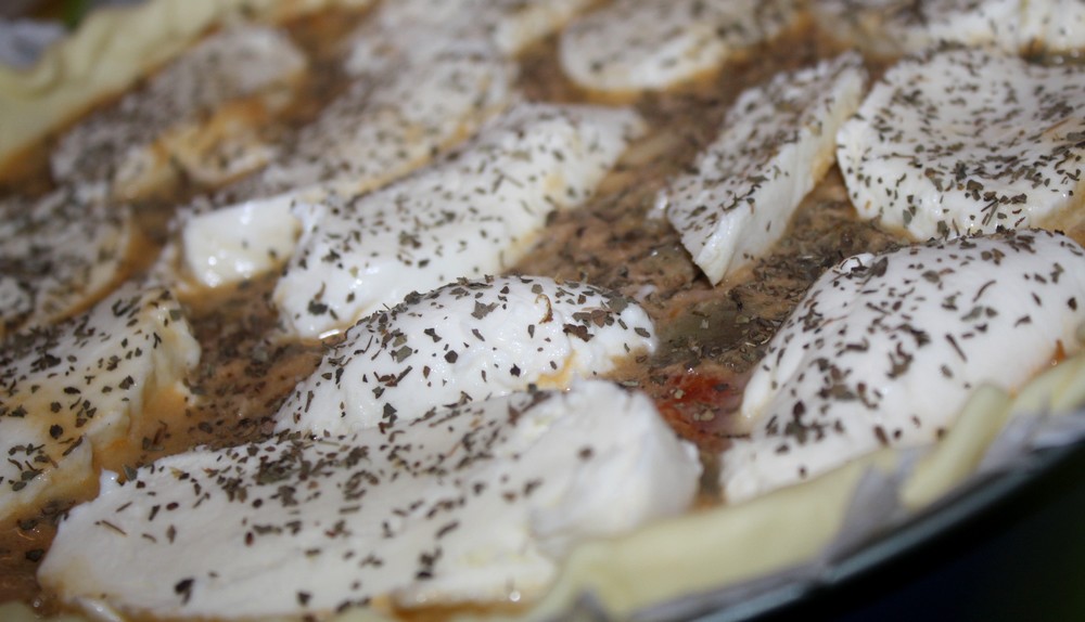Ajoutons la préparation sur la pâte à tarte, recouvrons de mozzarella coupé en tranche et parsemons de basilic.  Le tout au four pour 45 minutes à 180°.