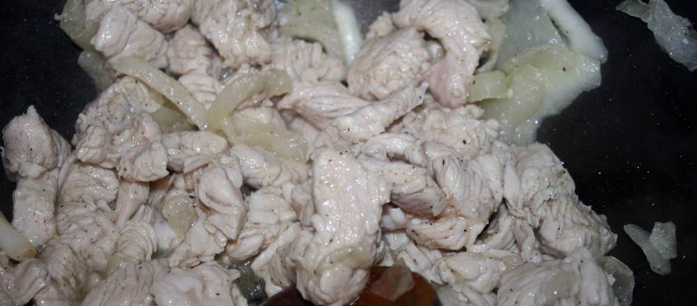 Dans un premier temps, faisons revenir l’oignon. Ajoutons l’escalope préalablement coupés en petit morceau, laissons cuire jusqu’à ce que la viande prenne une belle couleur. Ajoutons les poivrons, champignons et la crème. Mélangeons le tout, assaisonnons et ajoutons le curry. Laissons mijoter quelques minutes.