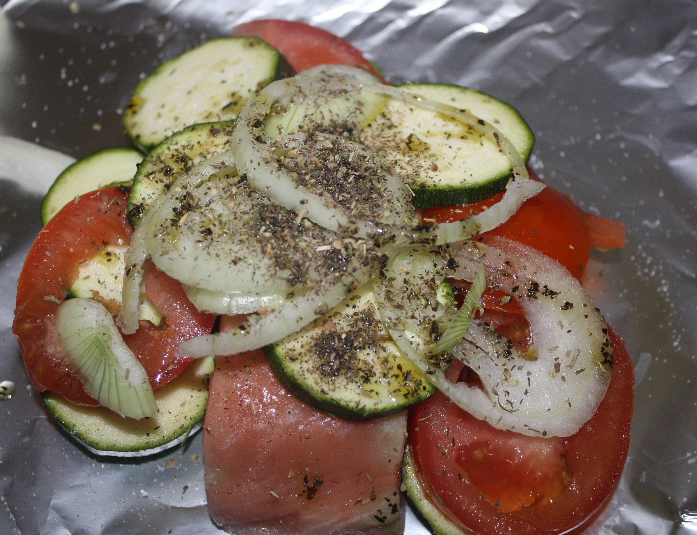 Sur le papier d’aluminium, déposons un pavé de saumon salons légèrement  quelques rondelles de tomates, de courgettes, d’oignons, parsemons d’huile d’olive, assaisonnons et recouvrons d’herbe de Provence. Refermons la papillote, le tout au four à 200 ° environ 30 minutes. A déguster avec un peu de riz par exemple !