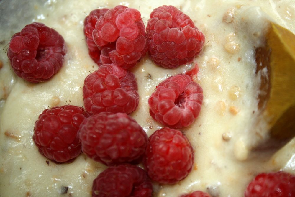 Intégrons rapidement les framboises en mélangeant délicatement.