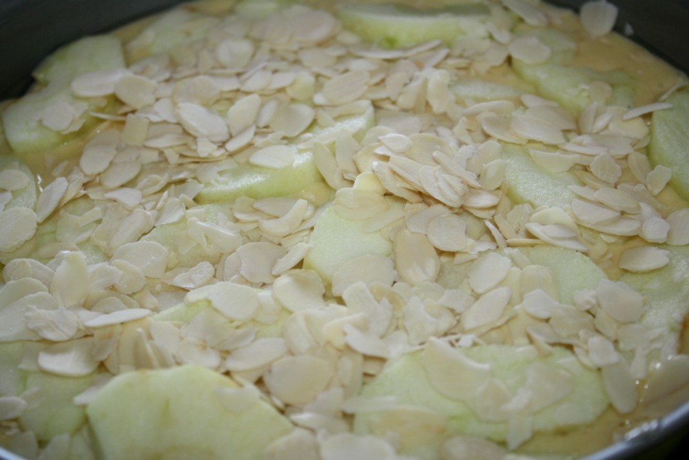 Dans un moule préalablement huilé ou beurré, versons la moitié de la pâte, ajoutons les pommes coupés en petit dés, un peu d’amandes éffilés, recouvrons du reste de la pâte et disposons les tranche de pommes et recouvrons aussi d’amandes effilés.