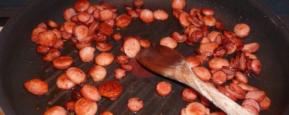 Dans un premier temps, coupons les knackis en fine rondelles et faisons les cuire (j’adore les faire bien griller!, mais ça, c’est à votre convenance) dans un peu d’huile d’olive.