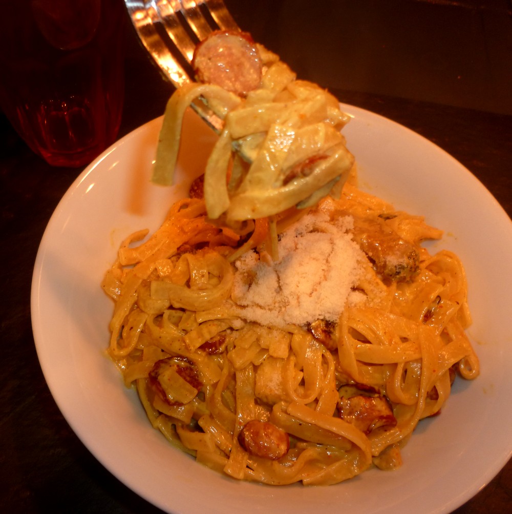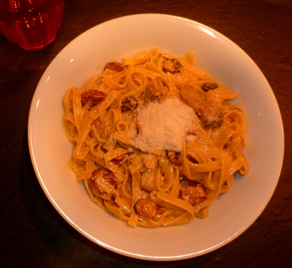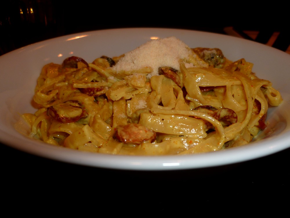 Je vous présente une recette que je réalise depuis longtemps, simple, mais une vraie tuerie. Ce n’est pas la recette du jour car aujourd’hui je n’ai pas eu le temps de me mettre au fourneau (audition de piano qui s’est terminé tardivement hihi), je l’ai cuisiné lors d’une soirée entre copines, d’ailleurs, elles se sont régalés, c’est le principal ! Donc pour cette recette, il suffit d’avoir un peu de curry, de crème, de champignons et de knackis ! Pour le coup, d’habitude je fais sans champignon et les copines m’ont mit la puce à l’oreille, donc j’ai essayé : tout aussi délicieux !