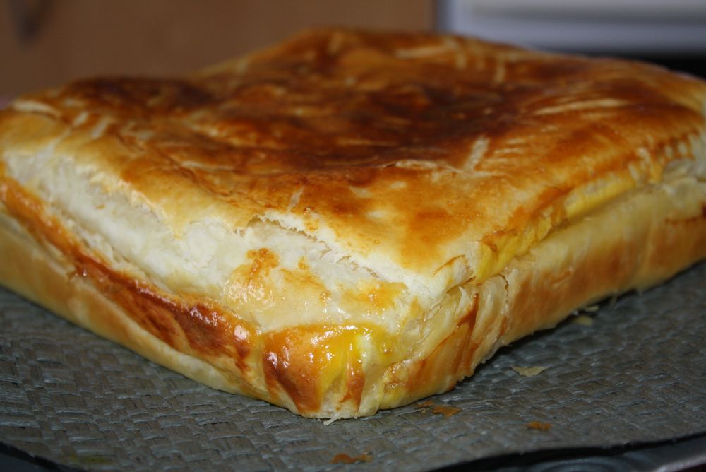 Après avoir battu les œufs en omelettes, assaisonnons et versons par dessus les oignons. Il nous suffit de recouvrir avec l’autre pâte et de badigeonner de jaunes d’œuf. Au four pour 40 minutes environ à 180°.