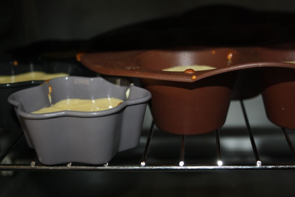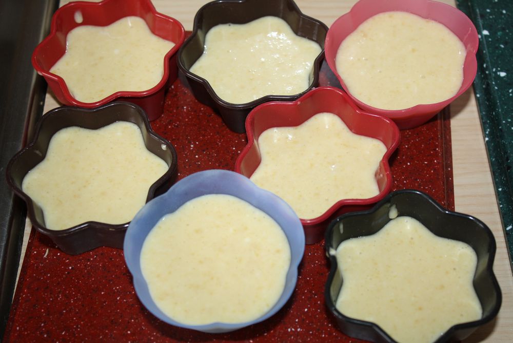 Versons la préparation dans des moules individuels (ou alors, vous pouvez faire un gâteau unique). Et au four pour 35 minutes à 180 °.