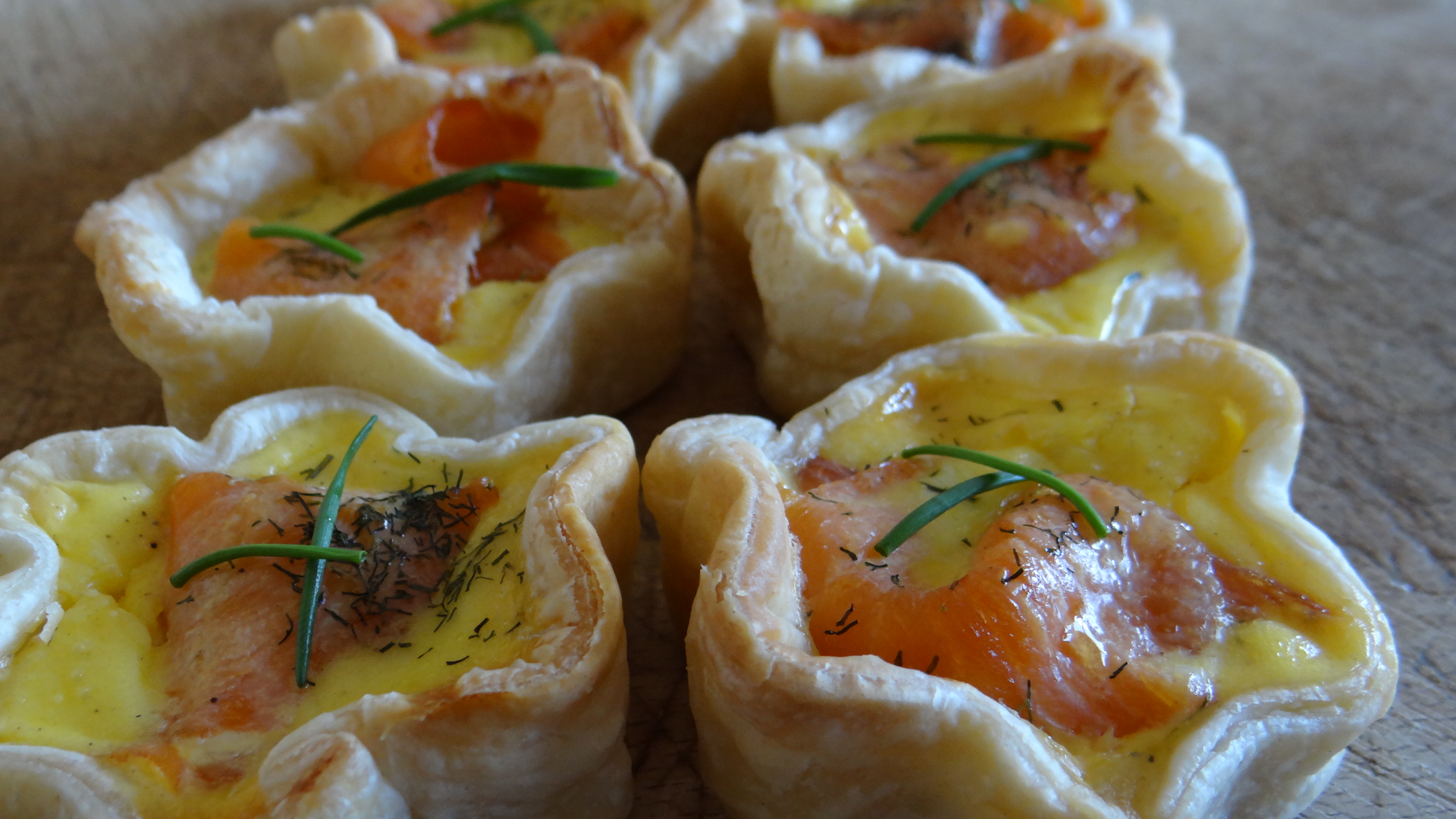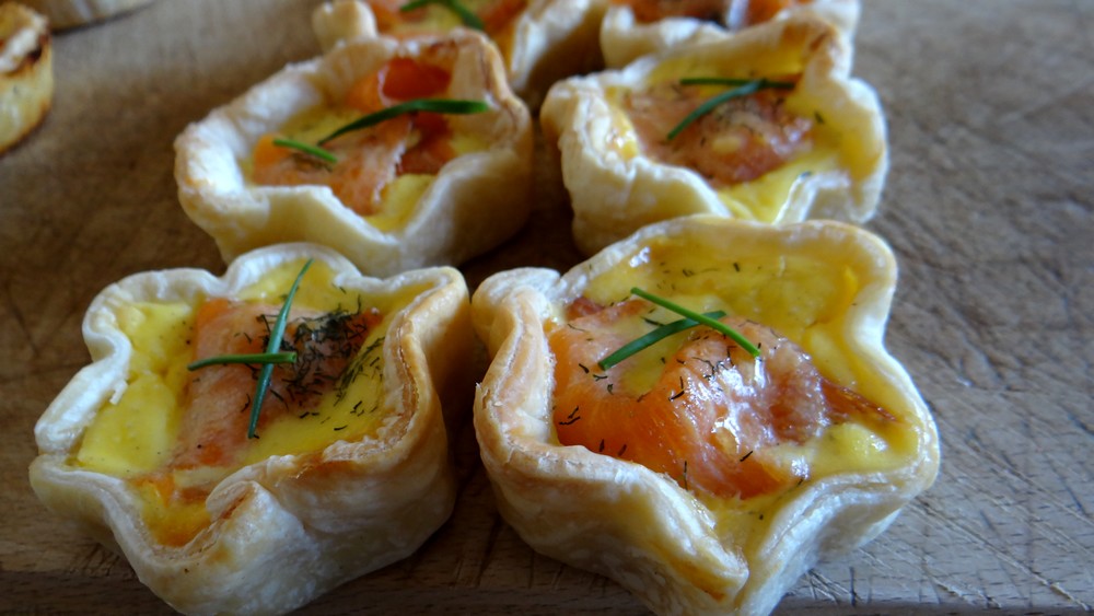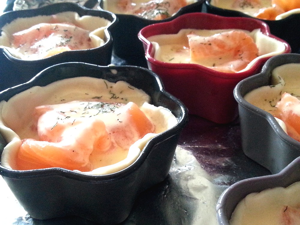 Disposons la pâte feuilleté dans les moules. Ajoutons un morceau de saumon dans chaque tartelette. Dans un récipient, mélangeons la crème, l’oeuf et le citron. Assaisonnons. Il nous suffit de recouvrir le saumon de la préparation, parsemons d’aneth. Au four pour 30 minutes à 180°.