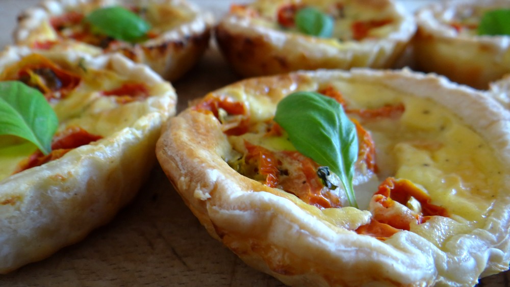 Disposons la pâte feuilleté dans les moules. Ajoutons une tranche de mozzarella dans chaque, ajoutons les tomates cerises (2 coupés en 2). Dans un récipient, mélangeons la crème et l’oeuf, asaissonons, et ajoutons le basilic séchés. Au four pour 30 minutes à 180°.