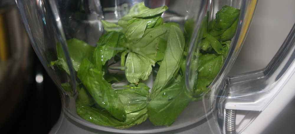 Dans un blender, mélangeons le basilic, l’ail, le jus de citron, l’huile d’olive et la crème. Assaisonnons puis mixons le tout.