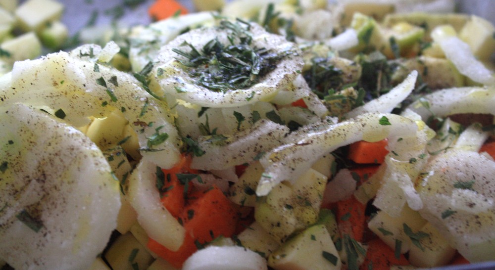 Vous allez voir, c’est très simple. Dans un plat, disposons la feuille de papier sulfurisé, ajoutons le filet de Colin, versons un filet d’huile d’olive et assaisonnons. Après avoir coupé les légumes en dès, disposons les par dessus, assaisonnons de nouveau, ajoutons un deuxième un maigre filet d’huile, un filet de jus de citron et l’estragon.
