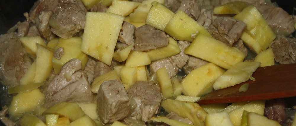 Ensuite, après avoir épluché les pommes, coupons les en petits morceaux et ajoutons les à la viande. Puis, assaisonnons et ajoutons le sirop d’érable. Laissons mijoter une 15 aine de minutes.