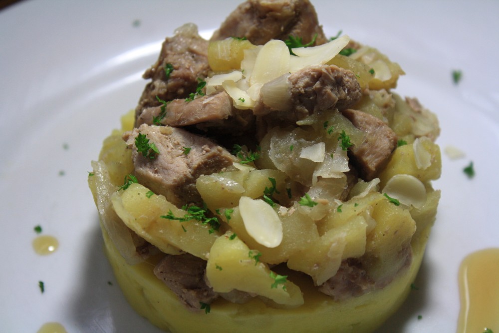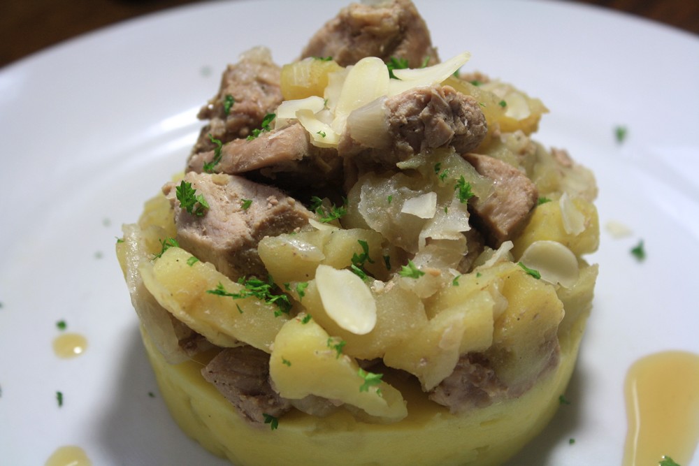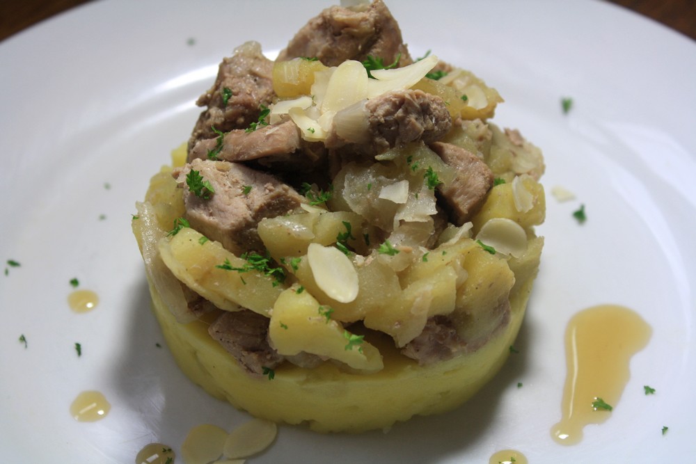 J’ai servi ce plat avec une purée de pomme de terre maison et j’ai parsemé d’amandes effilées.