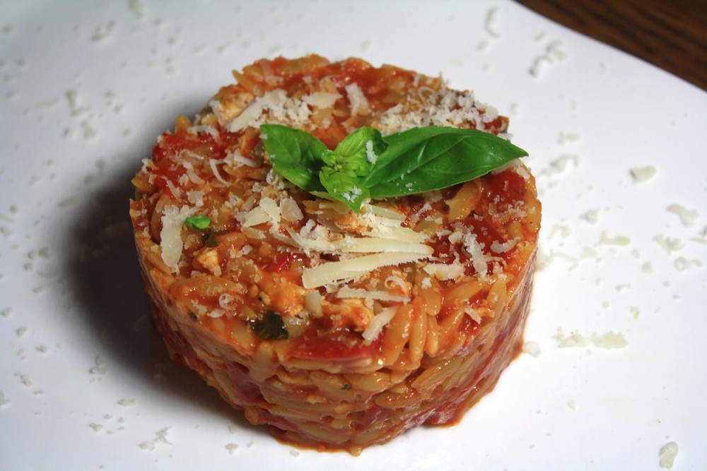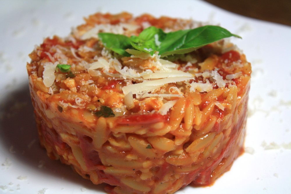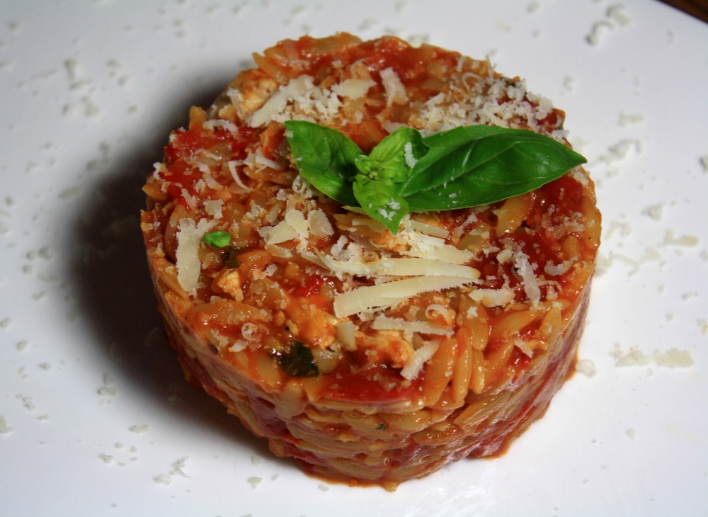 Vous vous souvenez de mes pâtes langues d’oiseaux ? Je les adore! Aujourd’hui, je les cuisine façon risotto, avec des tomates & des poivrons rouges et un peu de poulet quand même ! Et pour parfumer le tout, un peu de basilic et pour la gourmandise : le parmesan ! un délice !
