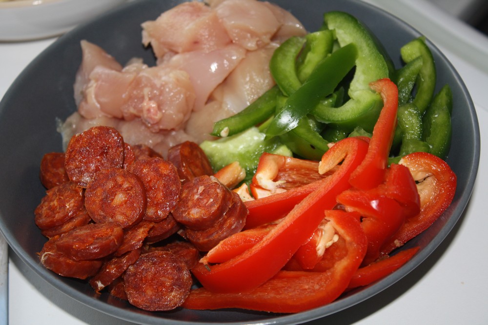 Commençons par couper le poulet en morceaux, tailler le chorizo et les poivrons en fines tranches, peler et concasser les tomates, hacher les oignons et l’ail.
