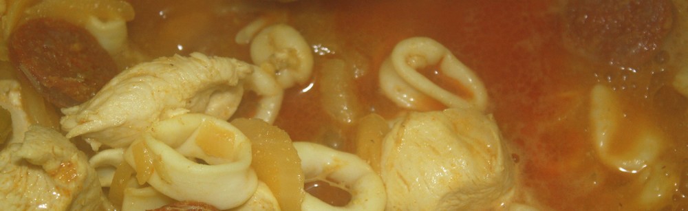 Dans une large poêle, versons de l’huile et faisons dorer les morceaux de poulet. Ajoutons les calamars, les oignons tout en remuant puis incorporons les tomates, l’ail, le safran, le sel et le poivre.