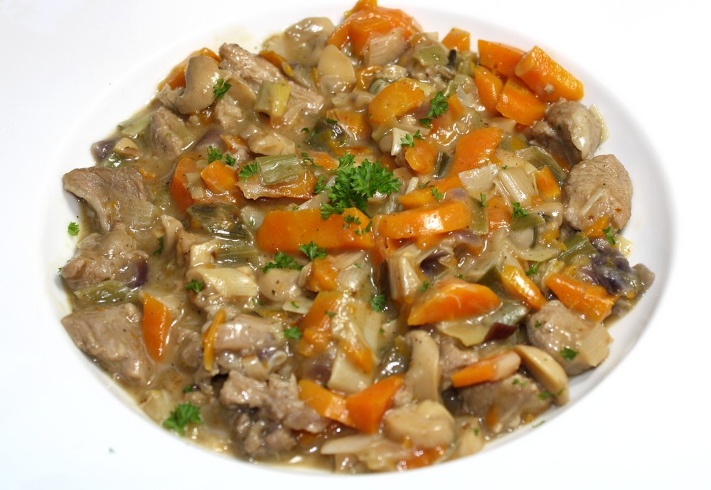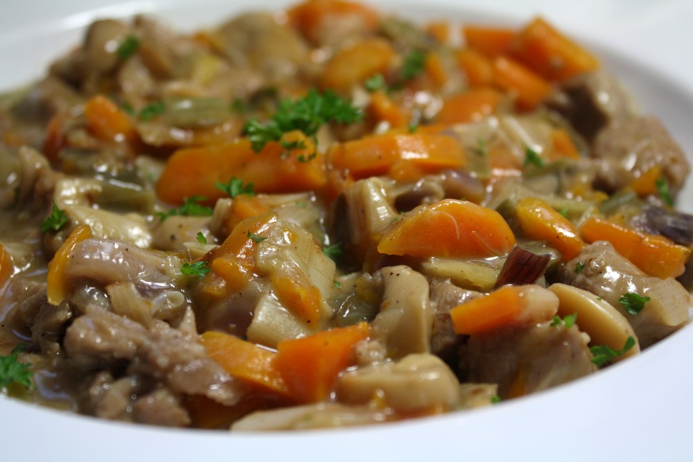 Dans un premier temps faisons revenir l’oignon dans l’huile d’olive dans un auto cuisseur et ajoutons la viande. Une fois qu’elle est doré, ajoutons les légumes, champignons, la crème, le fond de veau et assaisonnons. Pour terminer, ajoutons l’eau et le thym puis fermons l’auto cuiseur. Une fois que le siflement retentit, laissons laissons cuire 25 minutes. Pour finir, lions la sauce avec la maizena.