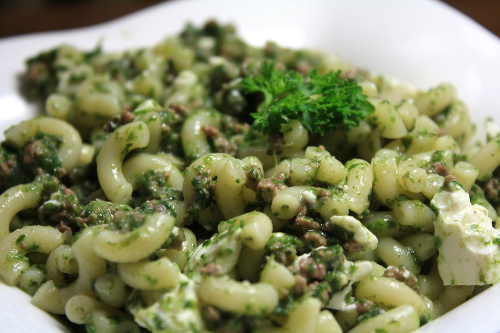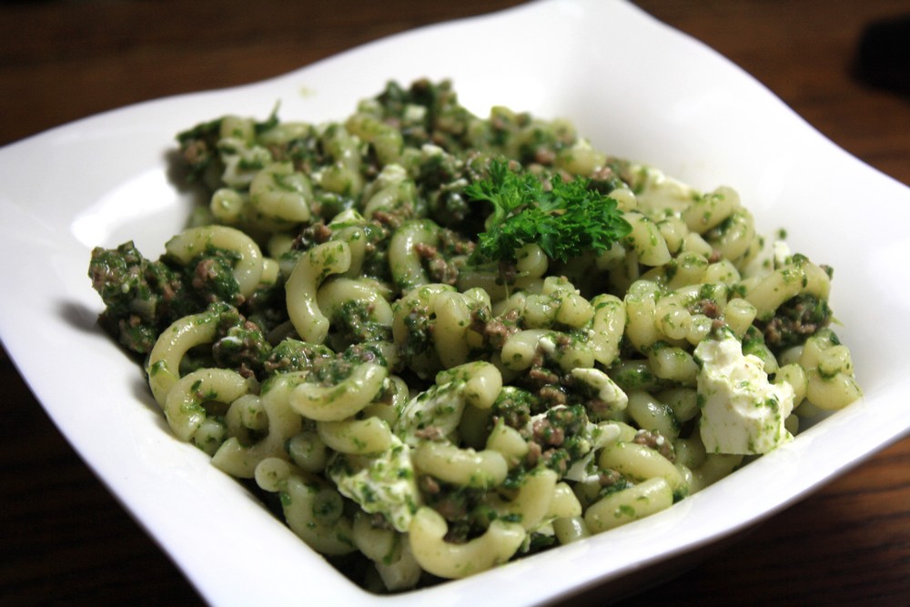 Coquillettes aux bœufs hachés, crème d’épinard & feta