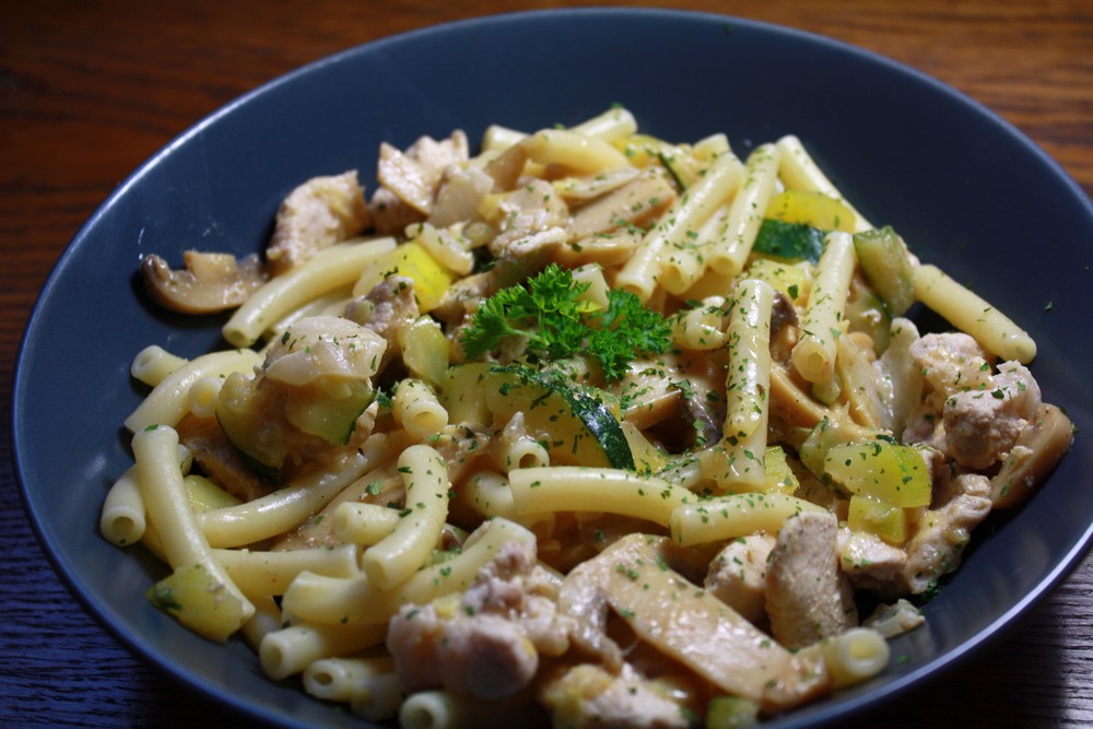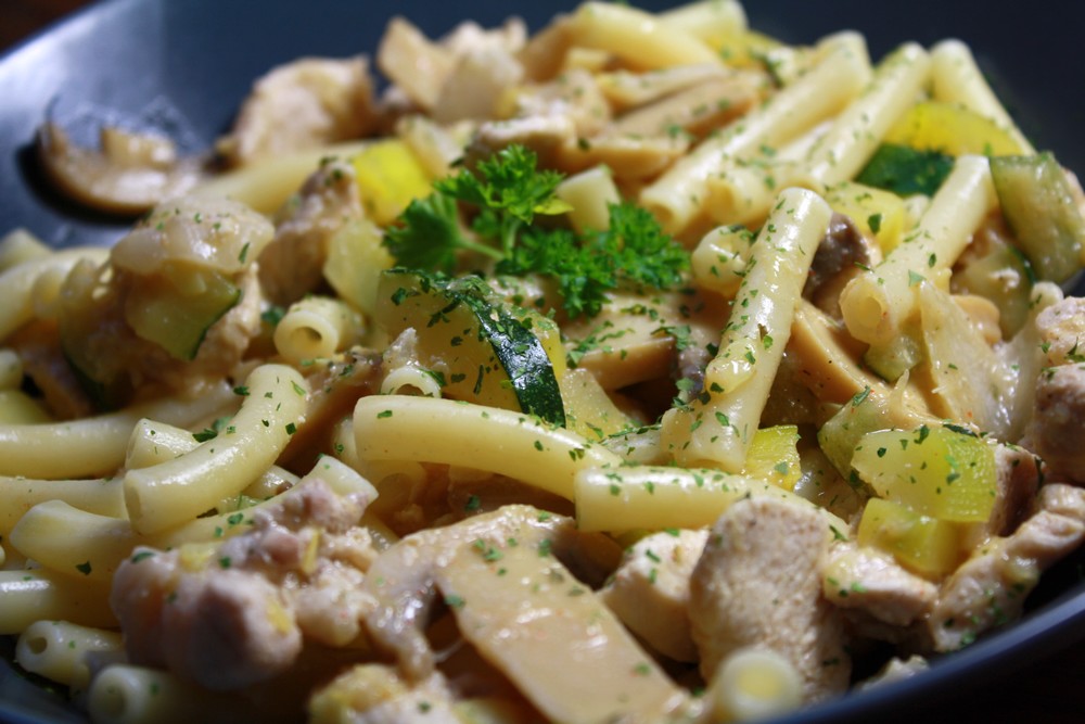 Un plat simple et délicieux. Une jolie recette de pâtes accompagnés par de la dinde, courgettes, champignons à la crème avec une pointe de piment. J’aime beaucoup les pâtes car ont peut les accommoder à notre « sauce » sans jeu de mot.. Tout comme les tartes ! Vous me connaissez, j’adore ça.