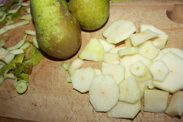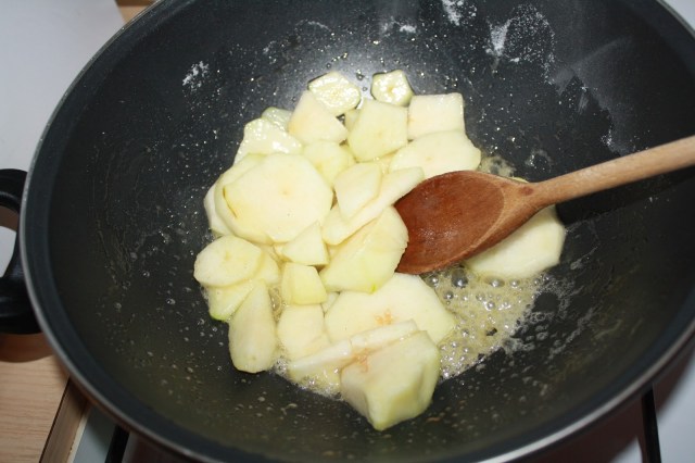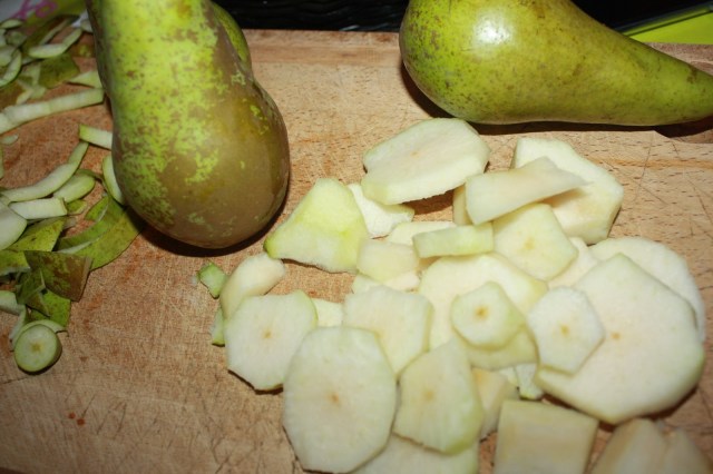 Une fois que le beurre est fondu, on ajoute les poires et le sucre.