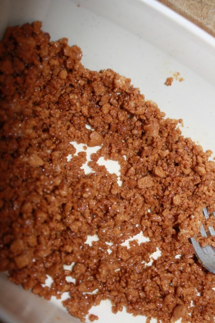 Disposons le mélange biscuit beurre dans le fond de mon moule, et tassons avec un verre.