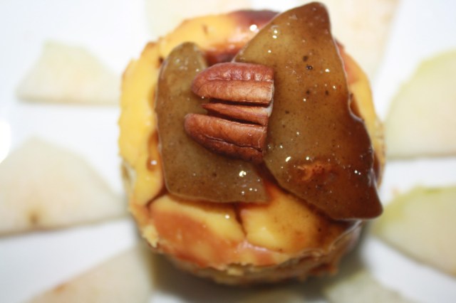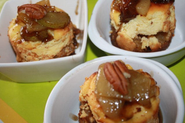 Le lendemain, on fait caraméliser les poires et on les dispose au dessus du gâteau. Et on ajoute une noix de pécan.