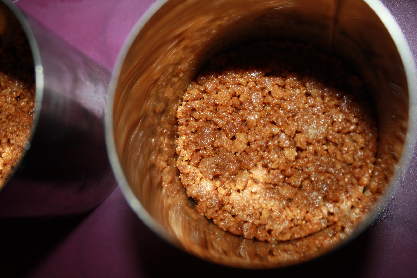 Disposons le mélange biscuit beurre dans le fond de mon moule, et tassons avec un verre.
