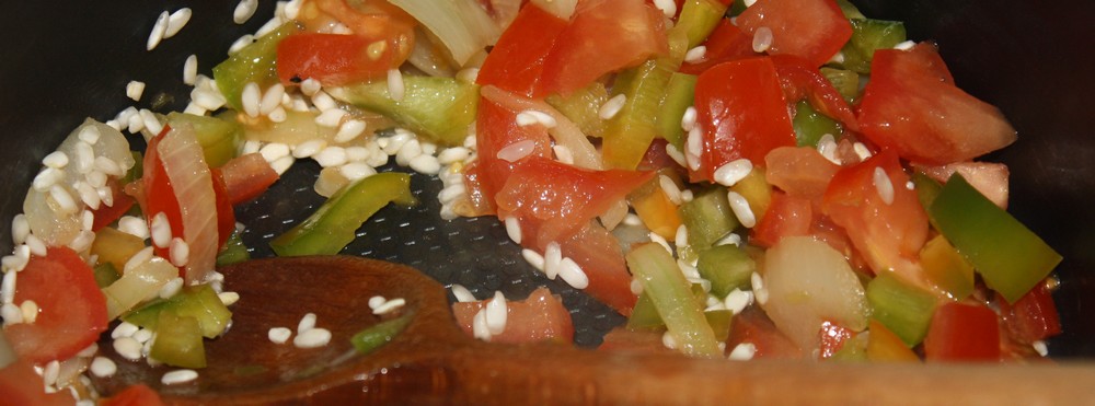 Dans un premier temps, faisons revenir l’oignon dans un peu d’huile d’olive, ajoutons le riz et laissons le devenir translucide. Ajoutons les légumes préalablement coupés en dès et les tomates pelés.