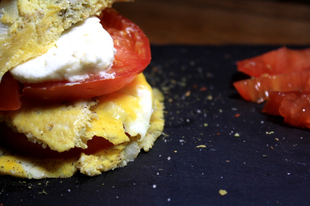 Puis, à l’aide d’un emporte pièce, réalisons 6 disques. Pour finir, dressons les milles feuilles : omelette, une tranche de tomate, une tranche de chèvre etc…