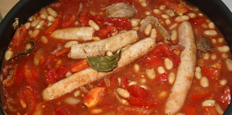 Dans un premier temps, faisons revenir les oignons et la viande dans l’huile d’olive. Dans un récipient, délayons le concentré de tomates et l’eau. Une fois qu’elle est cuite, ajoutons le jus de tomate les tomate pelés, l’ail, le thym, laurier et assaisonnons. Puis, laissons mijoter le tout à feu doux et couvert 15 minutes. Au bout des 15 minutes, ajoutons les haricots blancs et laissons mijoter 5 minutes supplémentaires.