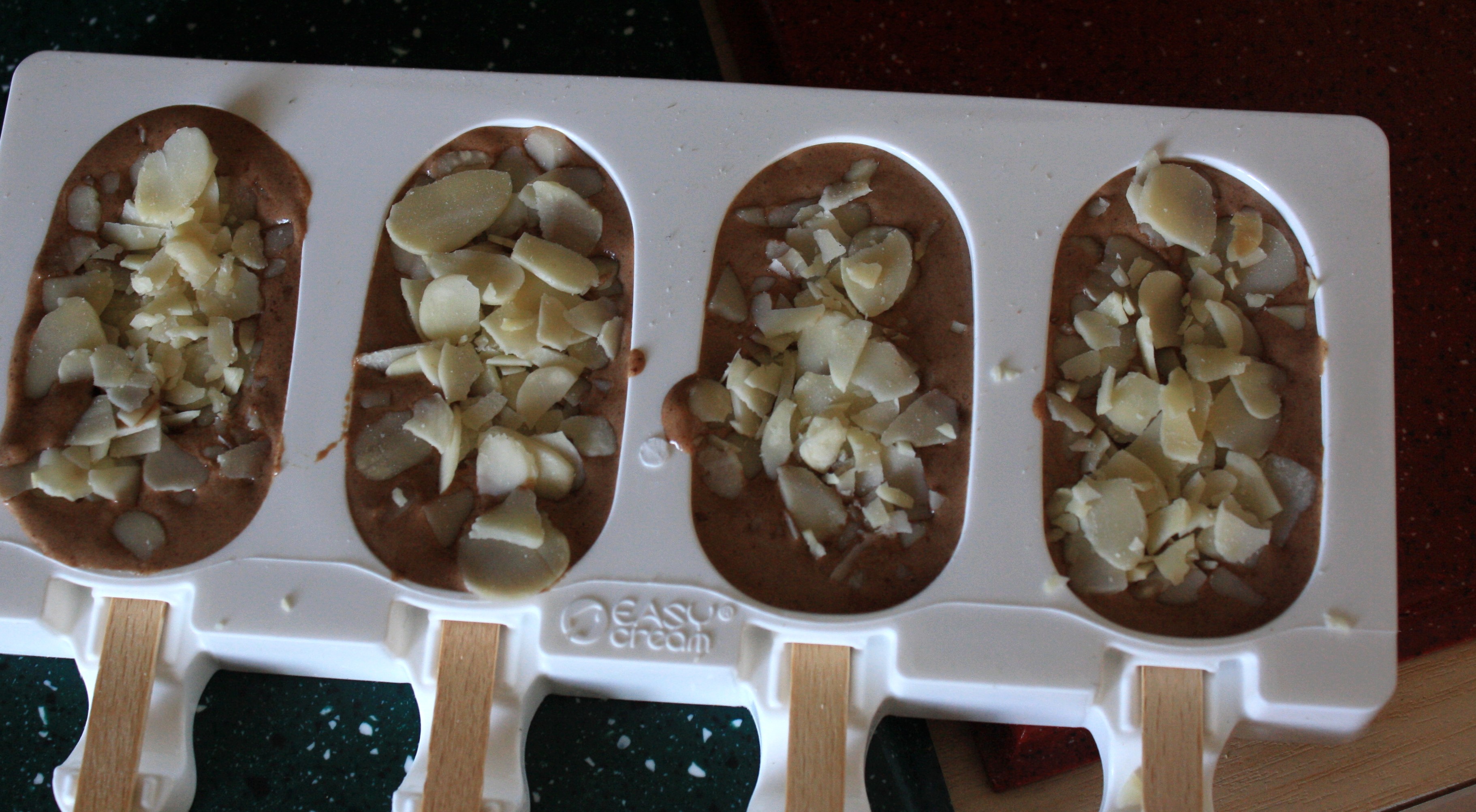 Il y a quelques temps, j’ai reçu de mon partenaire Silikomart des moules en silicone pour réaliser des glaces, donc voilà, je me suis lancée et je vous propose de délicieuse glace au chocolat, au sucre de nougat et amandes éffilés ! Une pure merveille croyez moi ! J’ai utilisé le sucre de nougat que j’ai reçu dans la BIG et le cacao amer de mon partenaire Keimling.