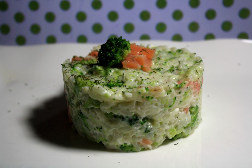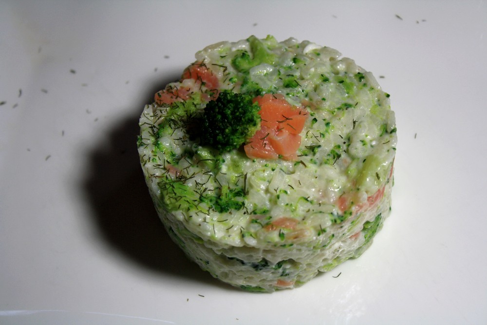Une fois que le riz est cuit (qu’il a absorbé pratiquement toute l’eau), assaisonnons, ajoutons le sel citron/aneth, ajoutons la crème de feta et les brocolis. Et pour terminer, il ne nous reste plus qu’à mettre le saumon, préalablement coupés en lamelle.