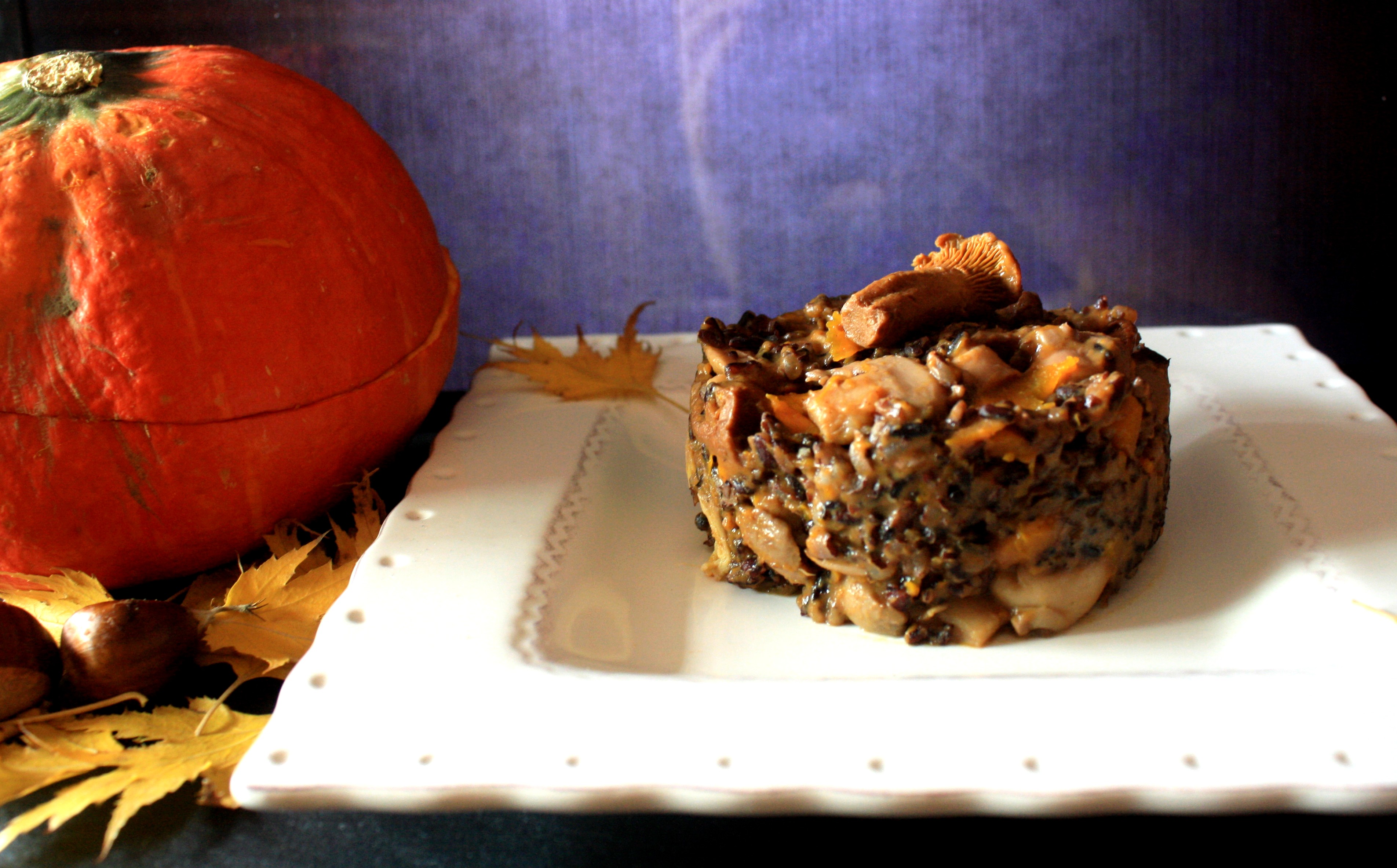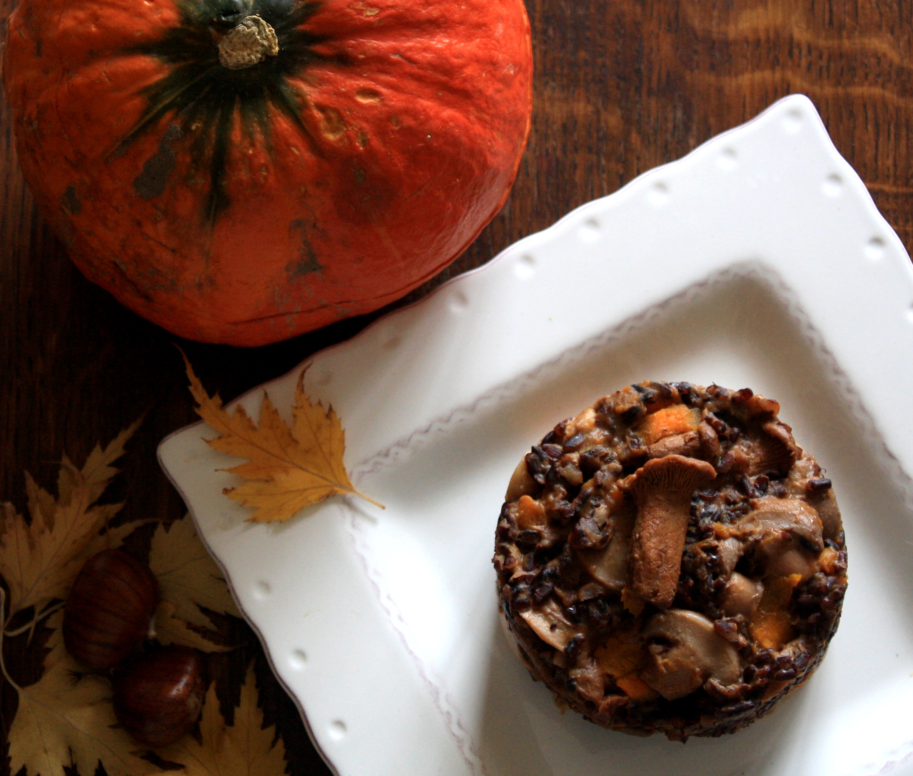 Automne flamboyant : risotto de riz noir aux champignons, potimarron & mousseline de marron