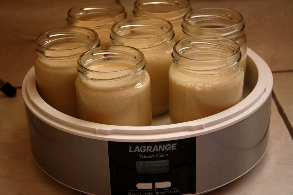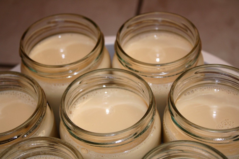 Ensuite, versons la préparation dans les pots, et disposons les dans la yaourtière pour ici 12 heures (afin d’obtenir des yaourts plus ferme). Sinon, le temps varie selon votre appareil ou le lait que vous utilisé.