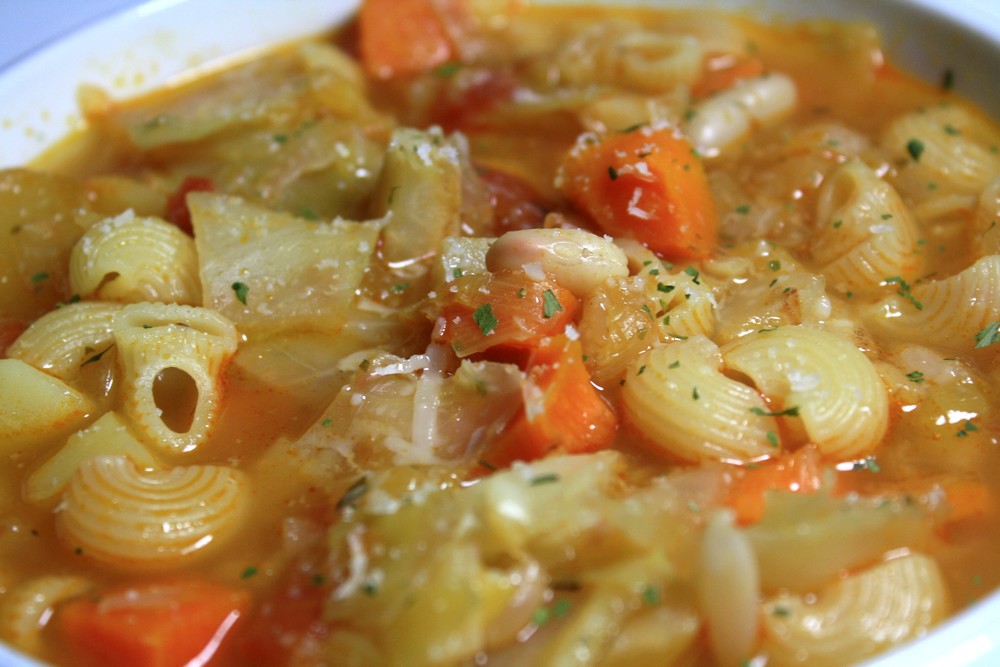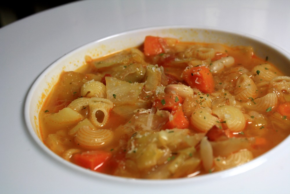 J’ai utilisé des carottes, poireaux, choux vert, tomates, haricots blancs, céléri, puis ajouté des pâtes. L’idéale, est d’utiliser de petites pâtes, mais après, c’est comme l’on veut !
