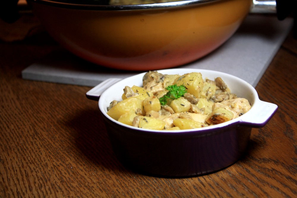 Une bonne poêlé, simple a réaliser et pleines de saveurs,  des pommes de terre, champignons, poulet accompagné d’une crème agrémenté de moutarde (de mon partenaire Melfor) et de l’arôme de saveurs Maggi. Vous ne connaissez pas ?  100% végétal l’arôme est un concentré de saveurs qui rehaussent en quelques gouttes la saveur de vos plats chauds et froids!