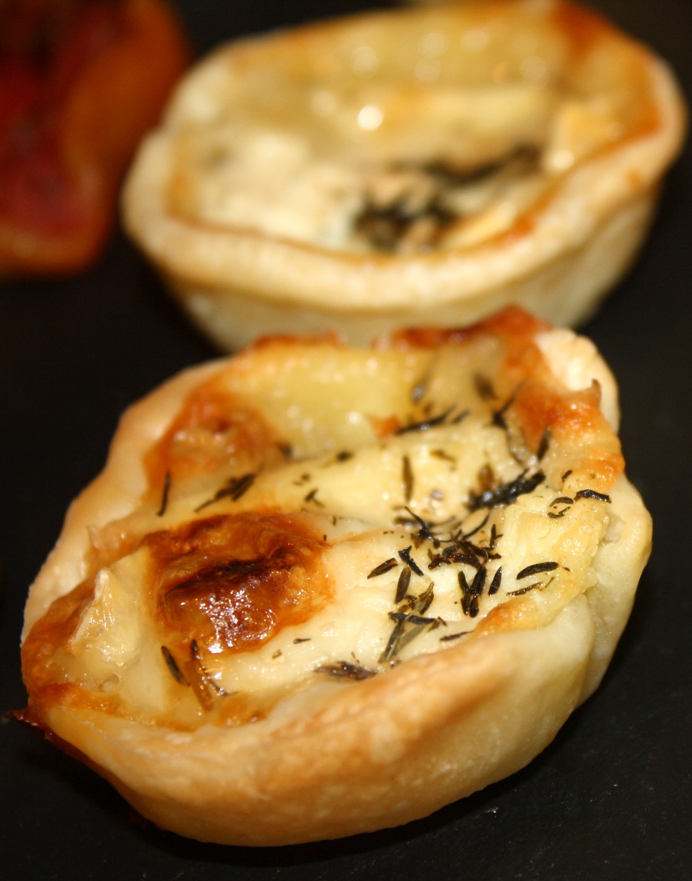 Dans des minis moules, disposons la pâte feuilleté. Ajoutons 1 cs de crème fraîche dans chaque panier, recouvrons d’une tranche de chèvre et versons 1 goutte de sirop d’érable sur chacun. Pour finir, un peu de sel, poivre et de thym.