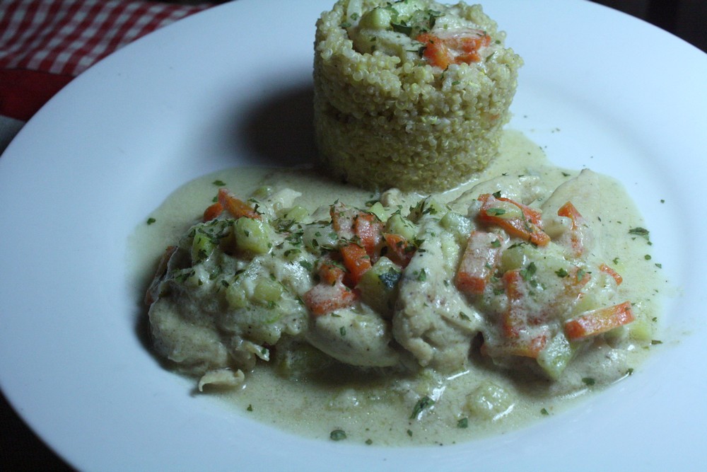 J’ai voulu faire une petite sauce pour accompagner mes aiguillettes de poulet : lait de coco au gingembre et citronnelle de mon partenaire Alter eco, un peu de crème fraîche et des carottes, courgettes coupés en brunoise. Je suis très étonnée des saveurs de ce lait de coco, nous sentons bien la citronnelle, c’est délicieux. J’ai accompagné ce plat avec du Quinoa blond de Bolivie, également reçu par mon partenaire.