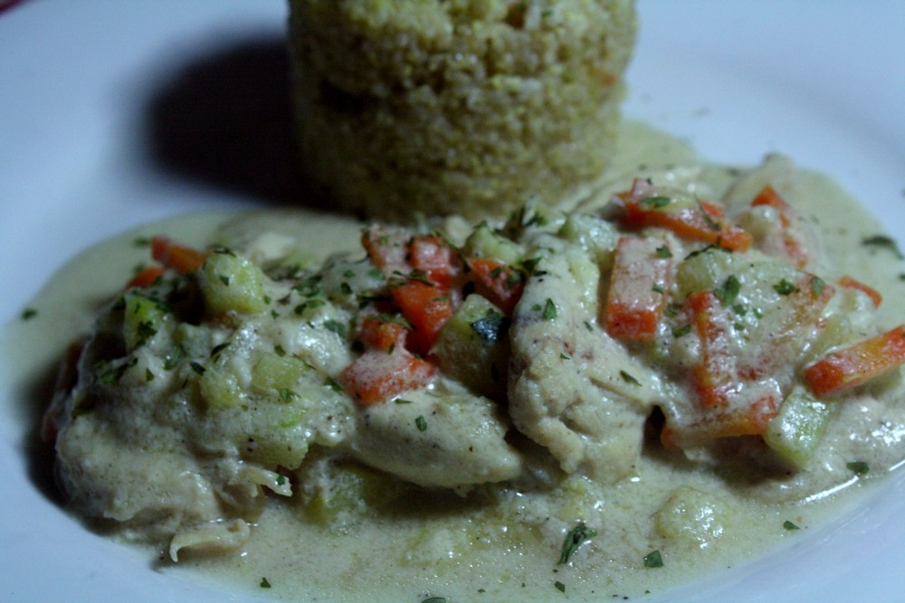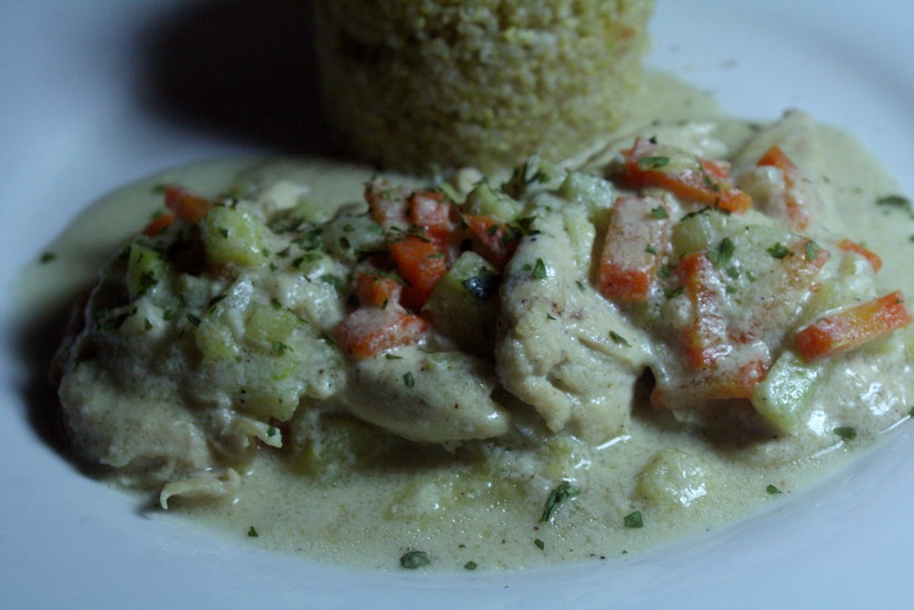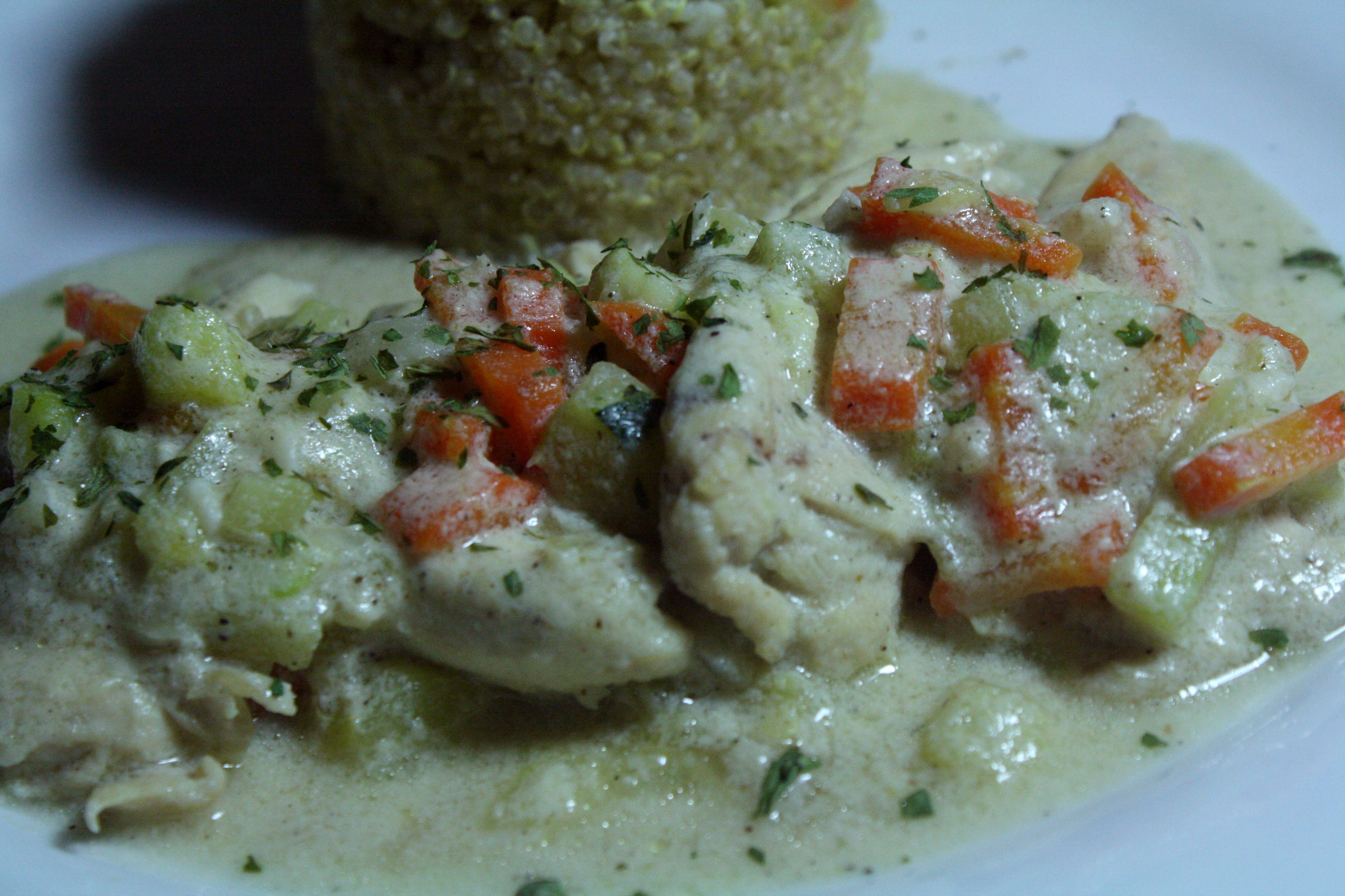 Après avoir coupés les légumes en brunoise, faisons revenir l’oignon dans un peu d’huile d’olive. Ajoutons ensuite les légumes. Laissons revenir quelques minutes en mélangeant régulièrement puis ajoutons le lait de coco et la crème. Assaisonnons, insérons l’ail en poudre et terminons par y plonger les aiguillettes de poulet qui vont cuire dans cette sauce. Laissons cuire entre 15 à 20 minutes à feu doux.