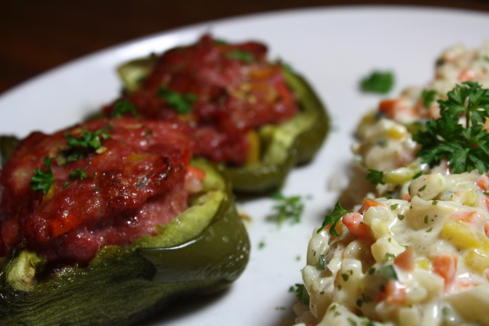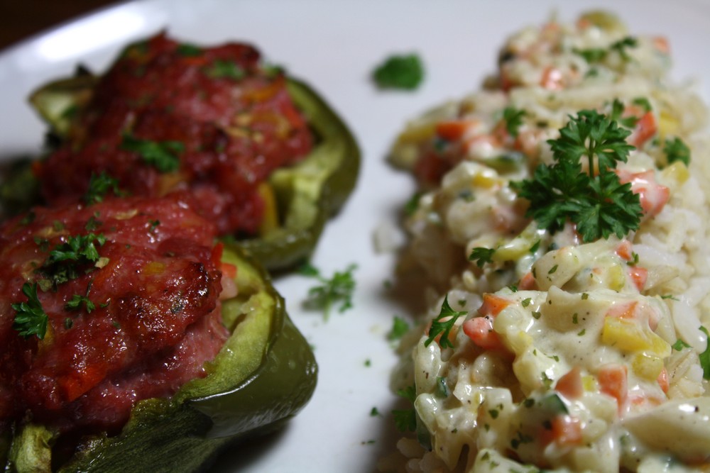 Il me restait quelques légumes dans mon panier et de la chair à saucisse alors je me suis lancée dans des poivrons farcis! Tellement bon, et ça me rappelles le soleil, pas vous ? Je sais pas vous, mais en tout cas j’ai besoin de soleil en ce moment ! J’ai farcis les poivrons avec de la chair à saucisse et de légumes (courgettes, carottes, panais). Nous avons dégusté cela avec du riz et une sauce et ces mêmes petits légumes, tout crémeux. Un régal.