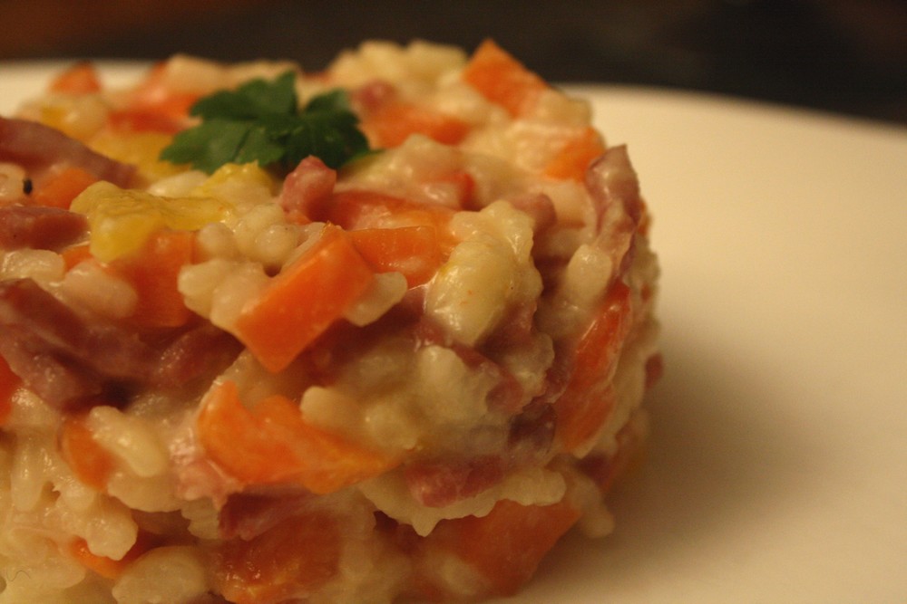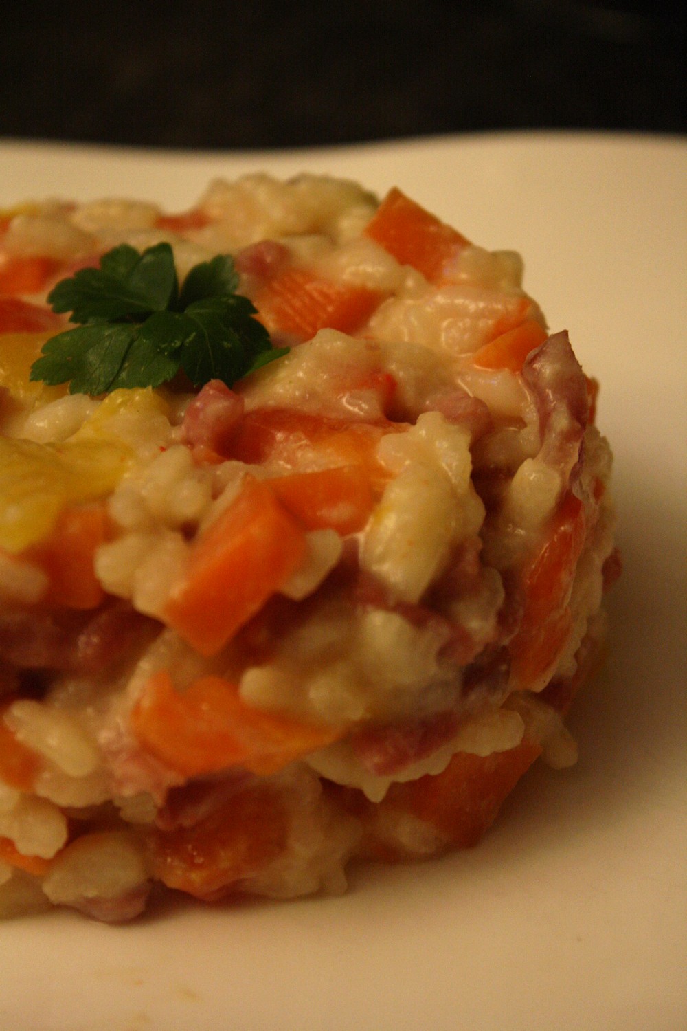 Tiens tiens tiens ! Une recette de risotto, ça faisait un bail non? Trop longtemps pour moi en tout cas :p. Alors ce soir, un petit risotto crémeux aux bacon fumés et petits légumes (carottes et poivrons). De la crème et du parmesan pour onctuosité. Un délice simple et rapide !