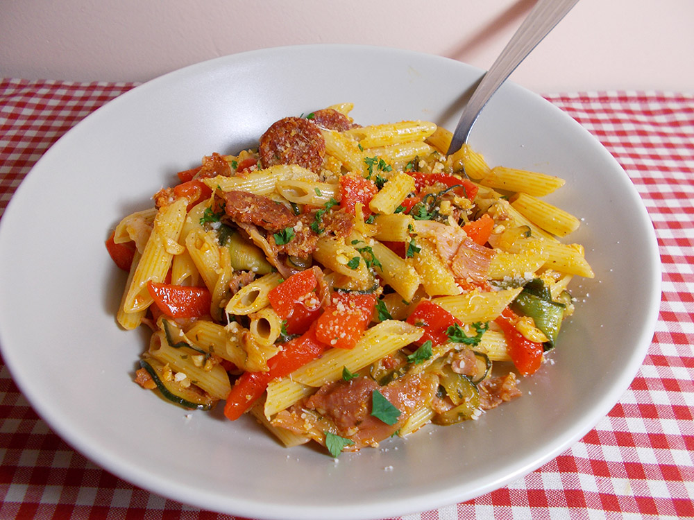 Du coup, me voilà en train de cuire les pâtes et de faire cuire poivron et courgette.. en ouvrant le frigo, je tombe sur un morceau de chorizo .. Et là, je me dis » pourquoi pas ? « . J’ai terminé par le jambon cru. Une alliance délicieuse, fondante grâce au parmesan en fin de cuisson.. à tomber !