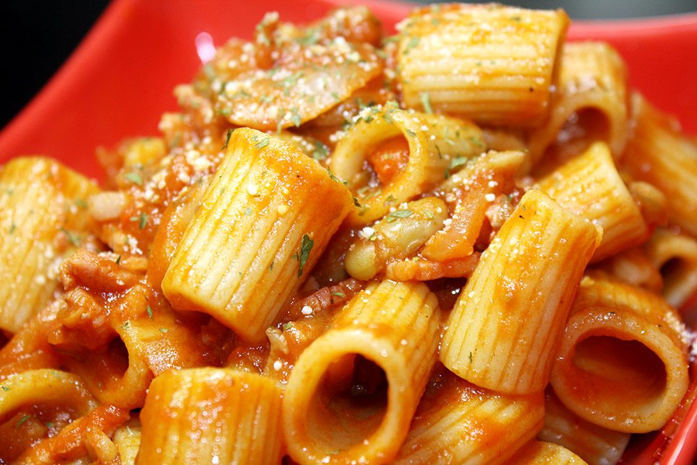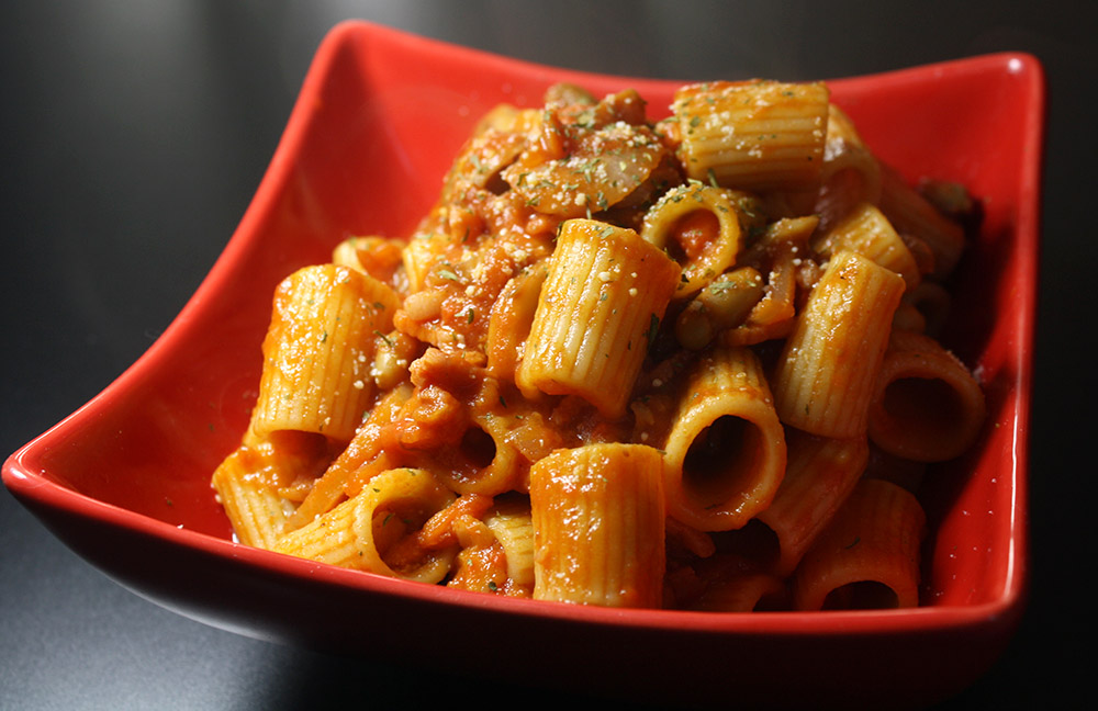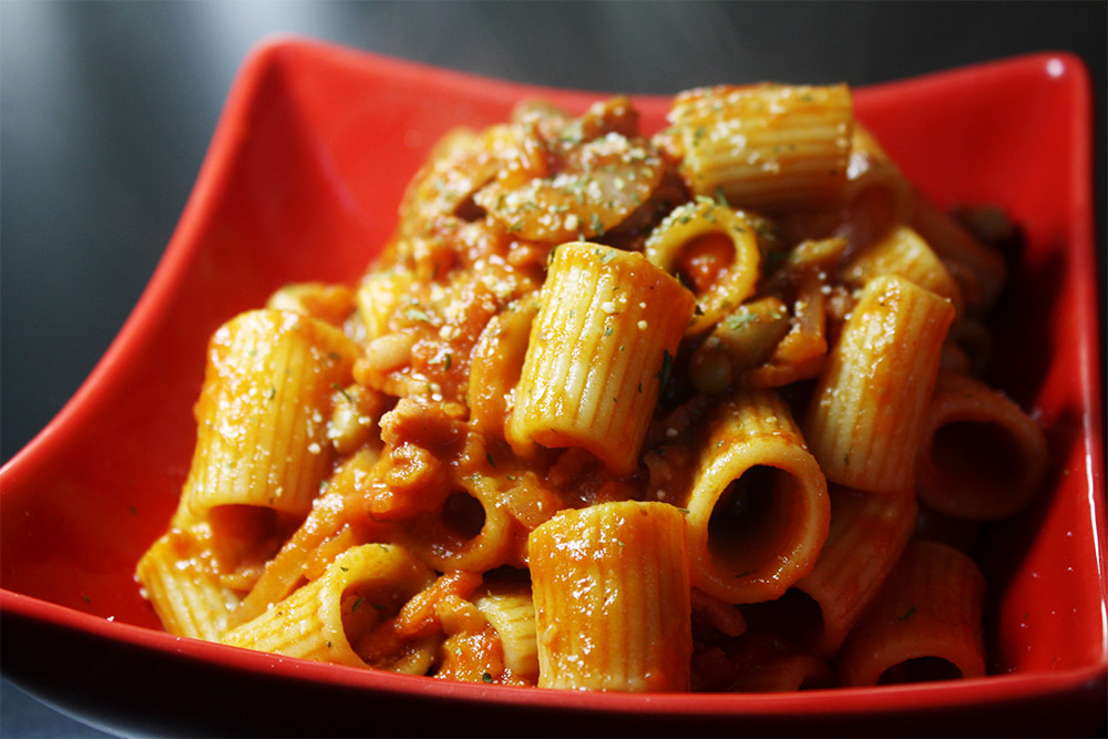 Dans un premier temps, faisons revenir l’oignon et la gousse d’ail finement émincés dans l’huile d’olive. Faisons ensuite revenir les lardons. Pendant ce temps, faisons cuire les pâtes selon les indications du paquet. Pour finir, ajoutons les champignons de Paris, la purée de tomate au basilic, assaisonnons et laissons mijoter quelques minutes.
