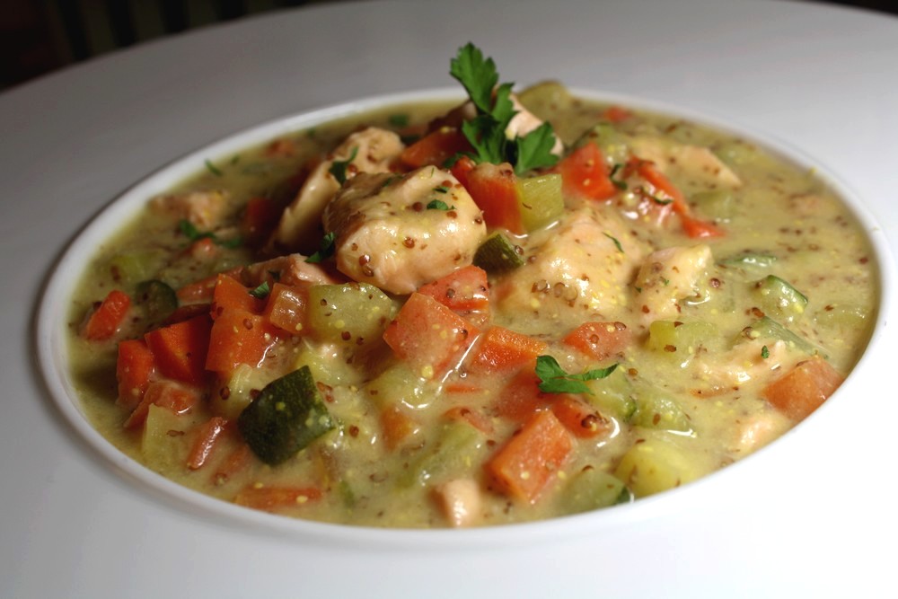 Faisons la sauce à la moutarde dans une casserole. Faisons fondre le beurre, ajoutons d’un coup la farine et mélangeons bien. Ajoutons ensuite le bouillon de cuisson des légumes, et laissons un peu épaissir. Incorporons la crème et la moutarde. Assaisonnons.