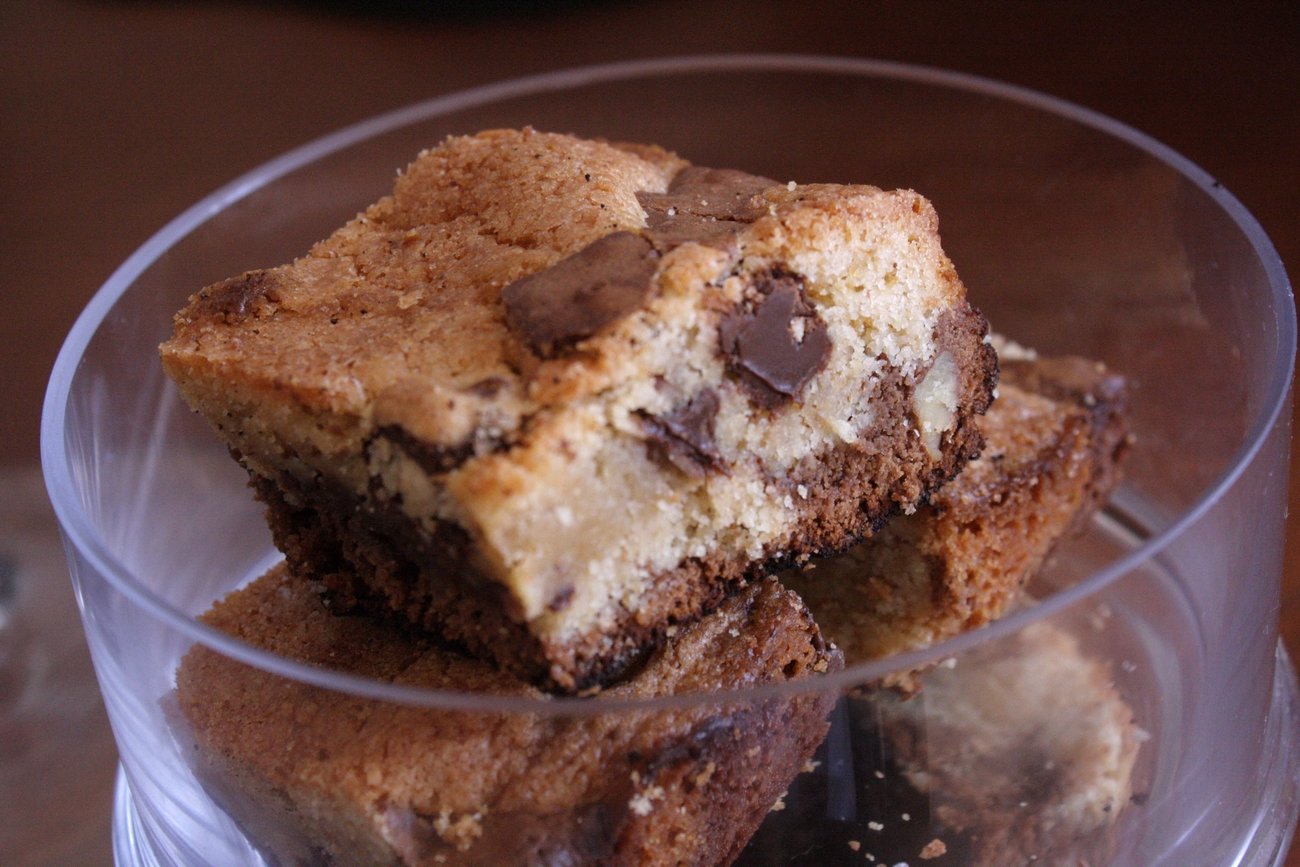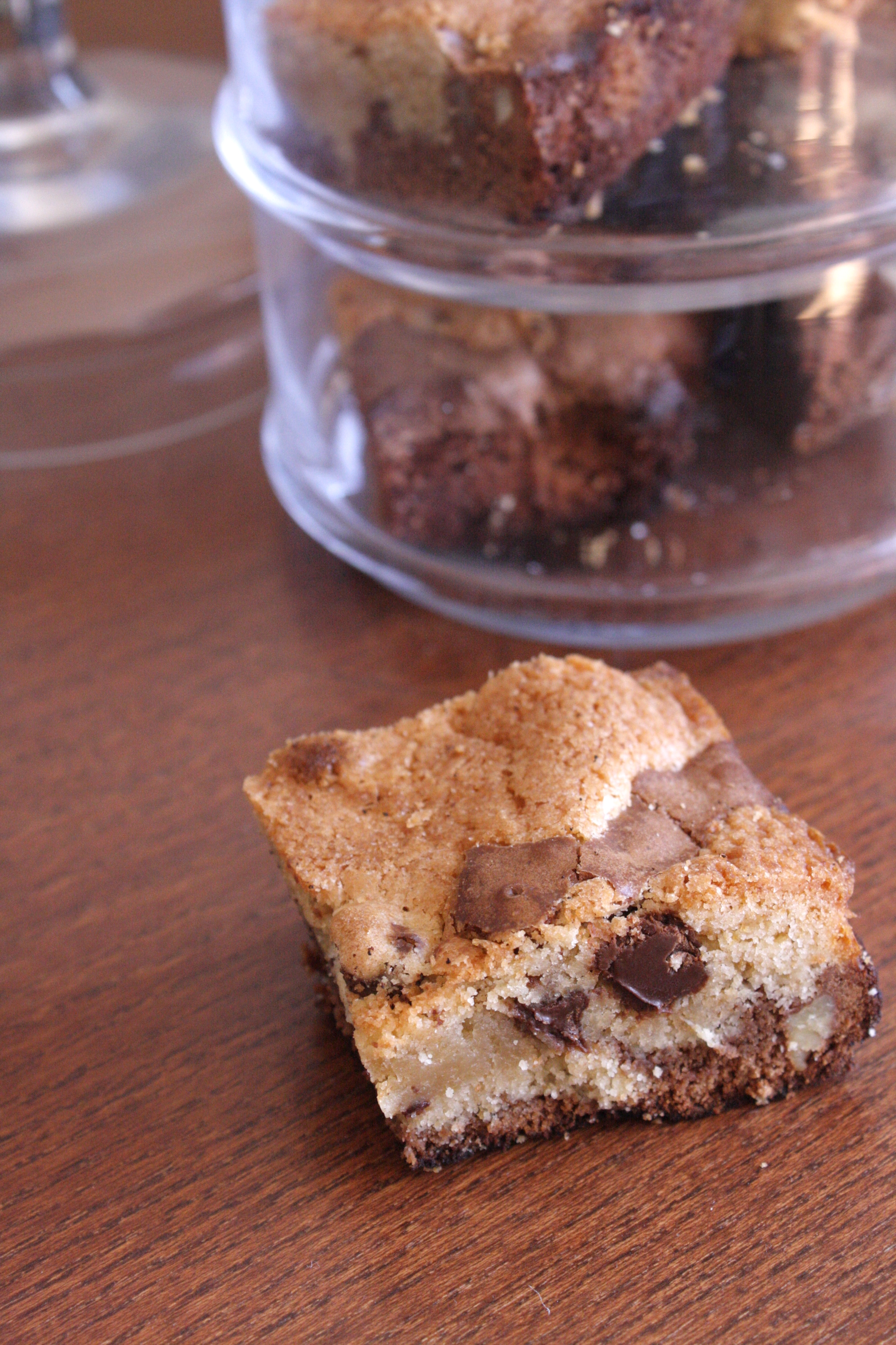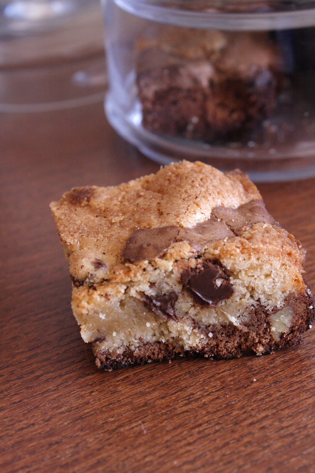 Pour la pâte à cookie : crémons le beurre et le sucre au fouet électrique, ajoutons l’œuf et mélangeons bien. Terminons par la farine, la levure tamisées ensemble et les pépites de chocolat, mélangeons rapidement. Parsemons la pâte à brownie de pâte à cookies en grosses miettes comme pour un crumble. Enfourner + ou – 20 minutes. La lame du couteau devra ressortir légèrement humide si vous voulez un brownie bien fondant. Laisser totalement refroidir avant de couper en carrés.