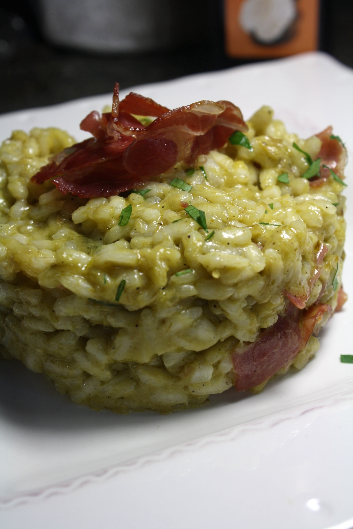 Un risotto, si je m’écoutais j’en réaliserai tout les jours moi, j’adore ça :p. Ce soir, j’utilise une autre sauce de la gamme Saclà, qui m’a gentillement fait parvenir il y’a quelques temps, de nouvelles sauces à l’occasion de notre projet « Risotto ». La sauce d’asperges Vertes est une recette raffinée à base de tendres et généreux morceaux d’asperges vertes, une texture onctueuse qui sublime parfaitement la saveur des asperges. Un véritable trésor culinaire. J’ai choisi d’accompagné ce risotto de coppa préalablement grillé au four et d’une pointe d’huile de truffe de mon partenaire «  123 pâtes« . Cette huile apporte une touche de fantaisie et des saveurs exquises. Une merveille !