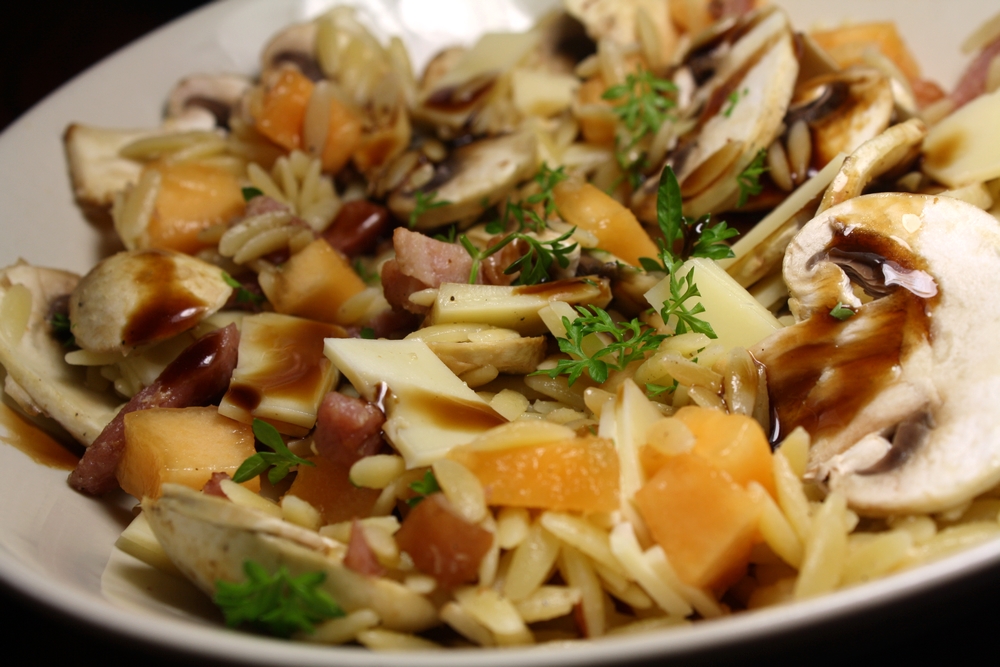 Lavons, épluchons et éminçons les champignons. Coupons de melon et le gruyère en dès. Disposons les lardons fumés dans un plat allant au four, puis faisons cuire sur mode grill environ 10 minutes à 250°.  Mélangeons ces ingrédients avec les pâtes, assaisonnons et versons la crème Melfor. Un délice.