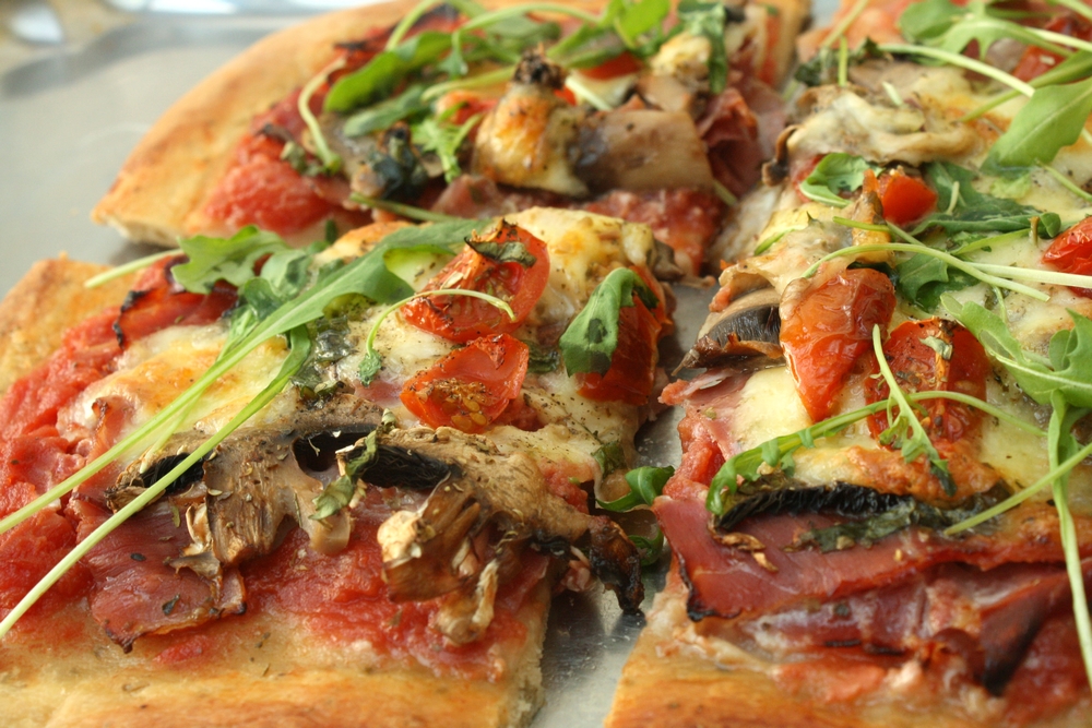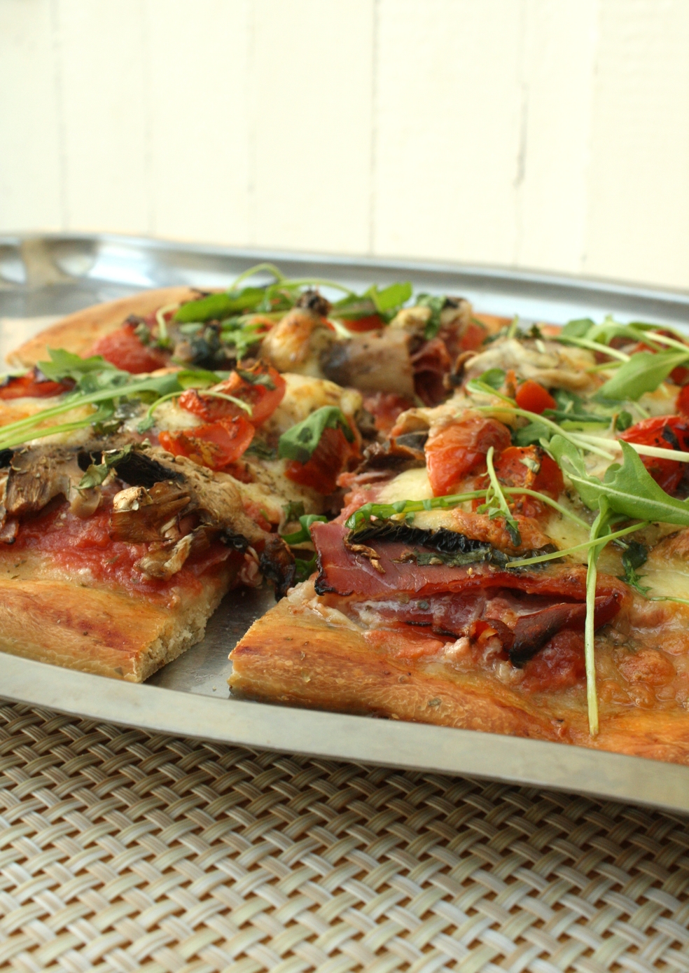 Pizza jambon cru, champignons, tomates cerises & mozzarella