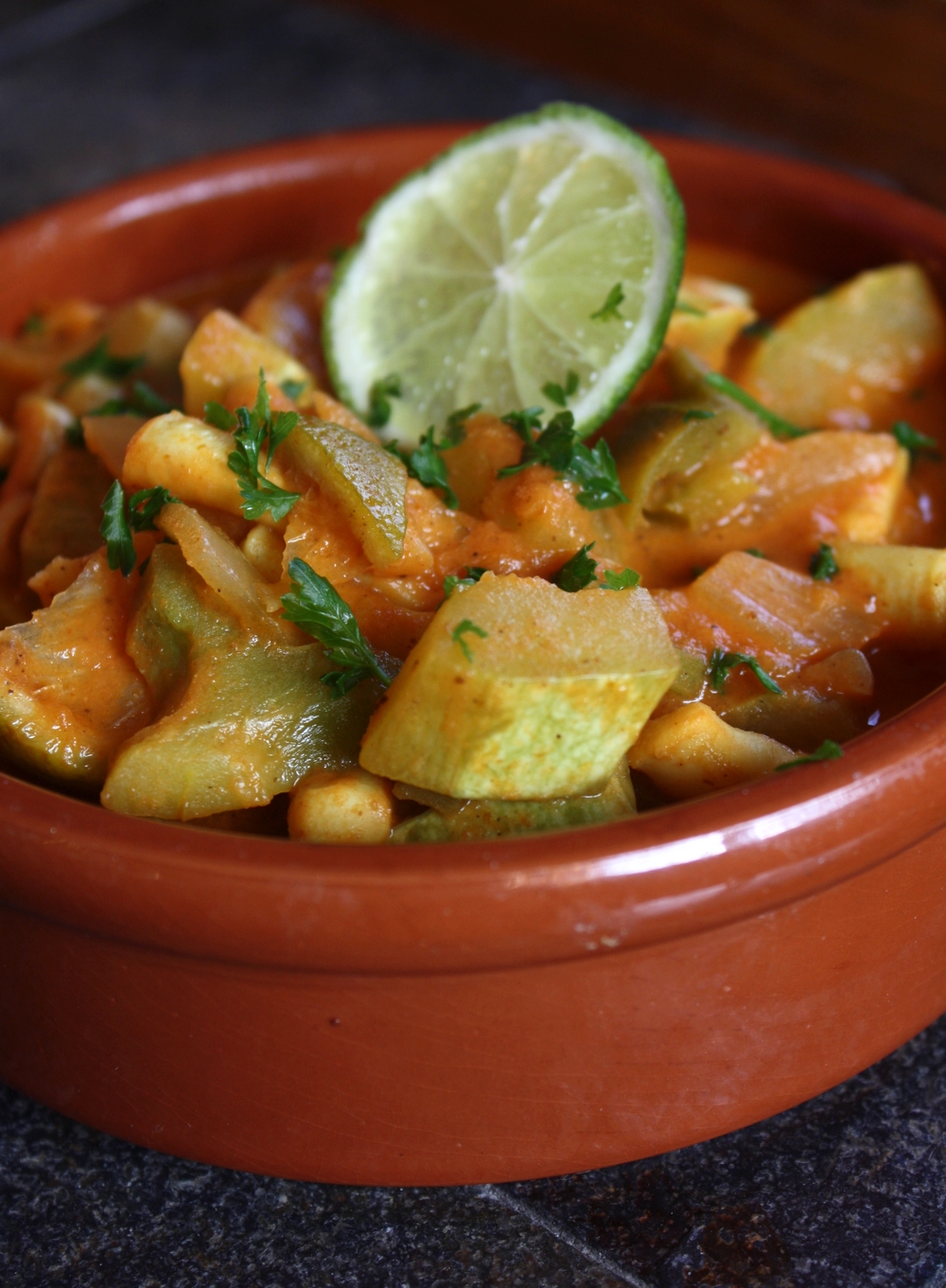 Terminons par la pâte de curry, le gingembre, le piment. Laissons mijoter 10 à 15 minutes à feux doux en mélangeant de temps en temps.