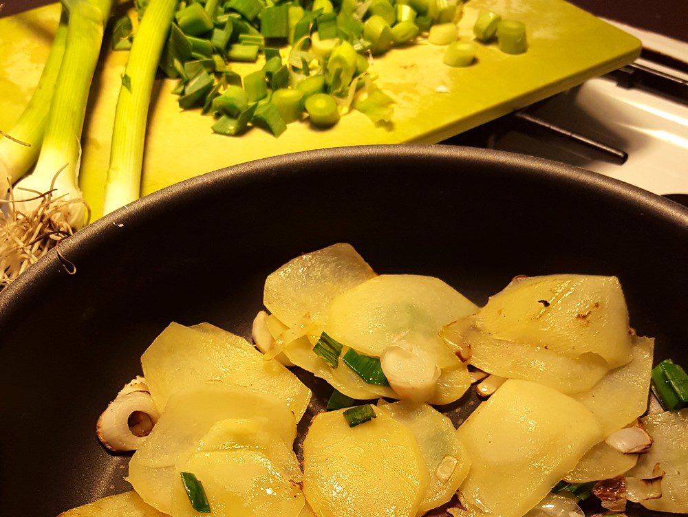 Séchons les pommes de terre et coupons les en fines rondelles et éminçons l’aillet finement (le bulbe ainsi que les tiges vertes).